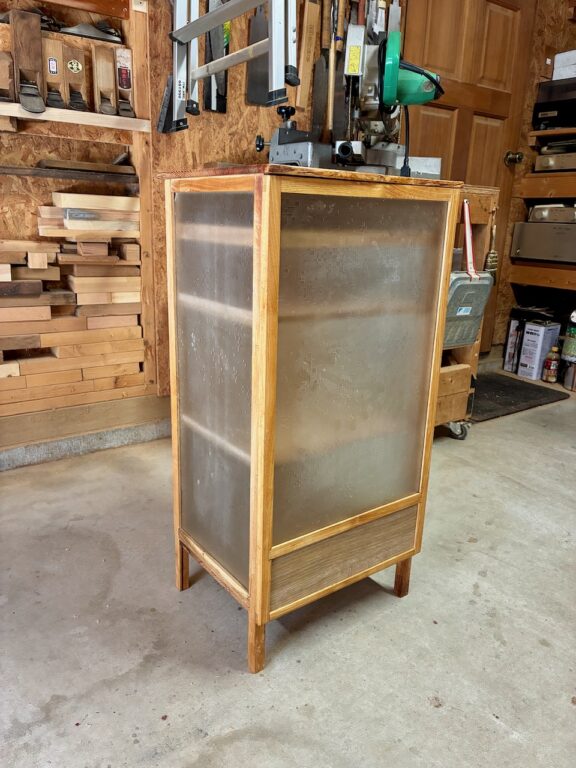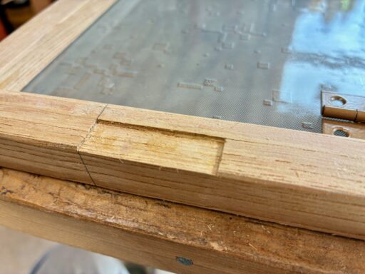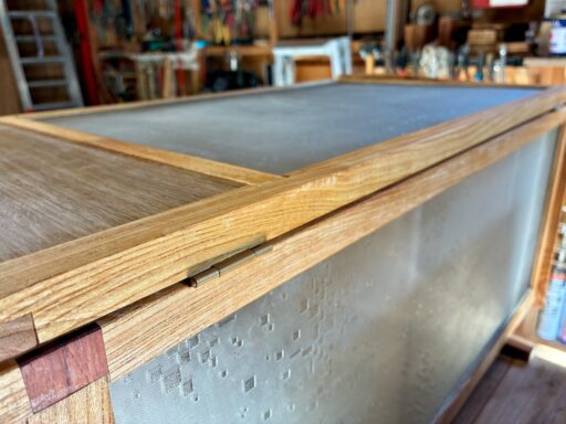 扉と側板の間に若干の隙間ができました。隙間なくピタッと合わせるには軸の部分を少し掘り下げるべきでした。そう言えば、木工師匠がそのような助言をしてくれていたのを思い出しました。