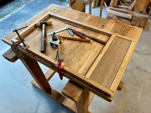 側板Bのフレームも反っているので、物凄く時間を要する作業になりました。反りを直しながら1ミリ未満の精度で直角を出すのは極めて困難。棚板以外を無垢材で製作しようとしたことに少々無理があったのかもしれません。