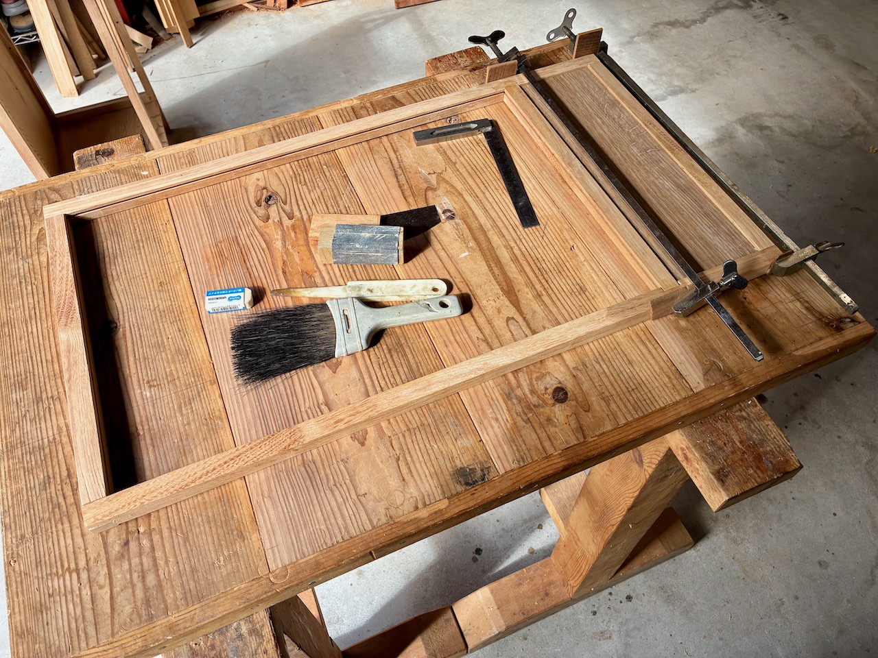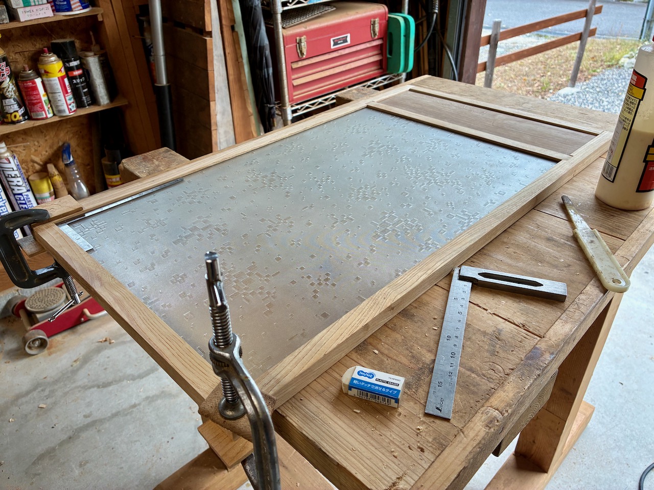 合板には接着剤は使わず、フレームを木工接着剤で固定中。