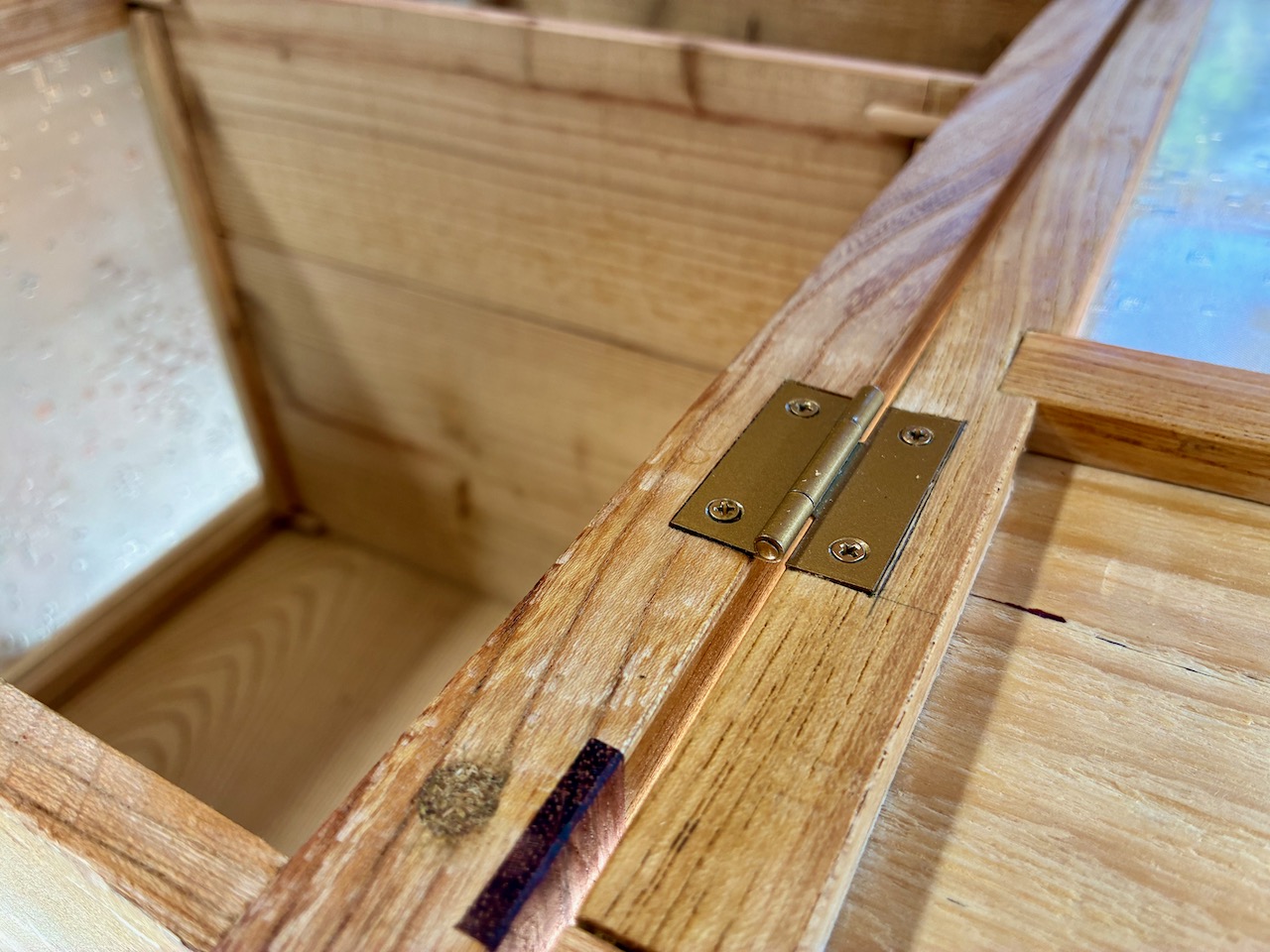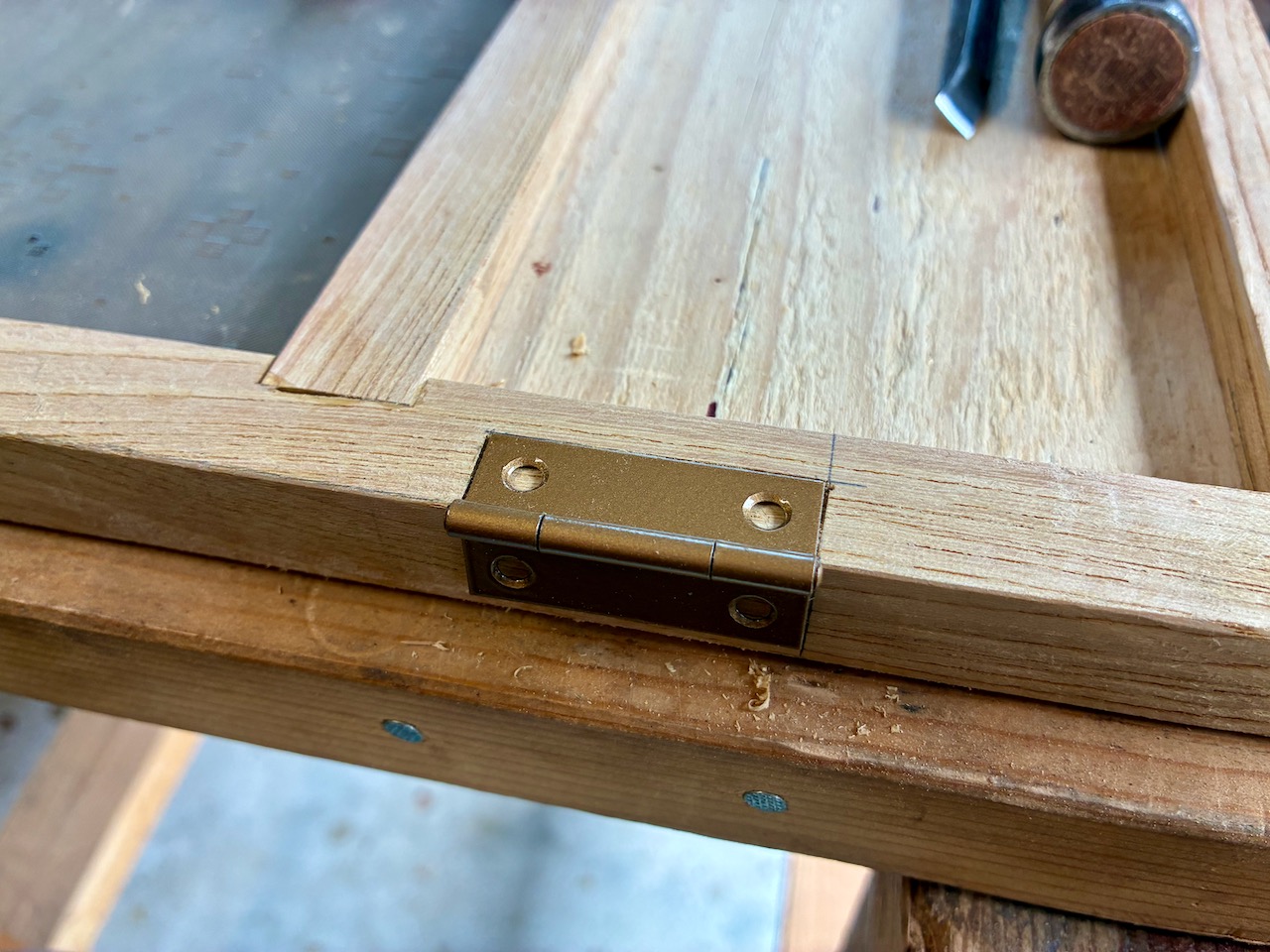 食器棚側板にも同様の加工を施して、蝶番を付けました。