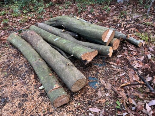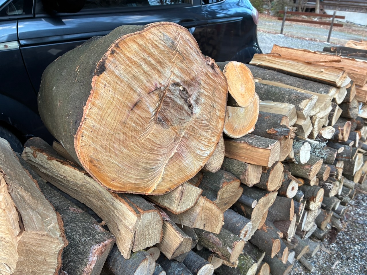 カーポートに置いた原木の一部は薪割りをする必要があります。気乾比重が0.83の硬いアラカシは斧や玄能の柄、杖の素材としても適材なので、そうした素材として使えそうなものは薪にせずに残しておく予定です。
