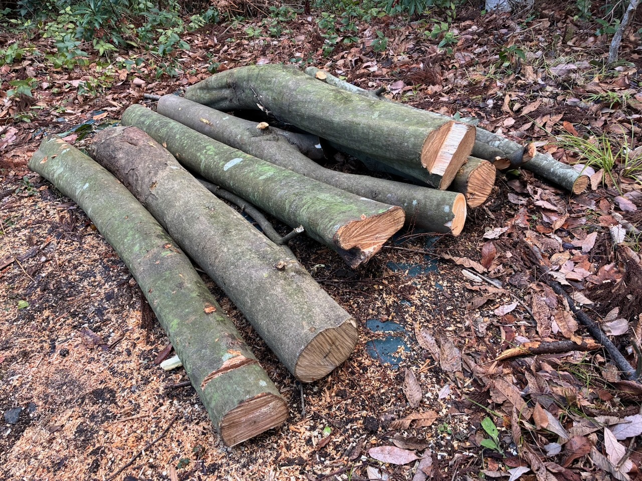 隣接するオーナーご自宅の広大な敷地に薪になりそうな原木が大量に置いてあるのを見つけ、用途を尋ねると、「よかったらお持ち帰りください」とこの上なく嬉しい応えをいただきました。