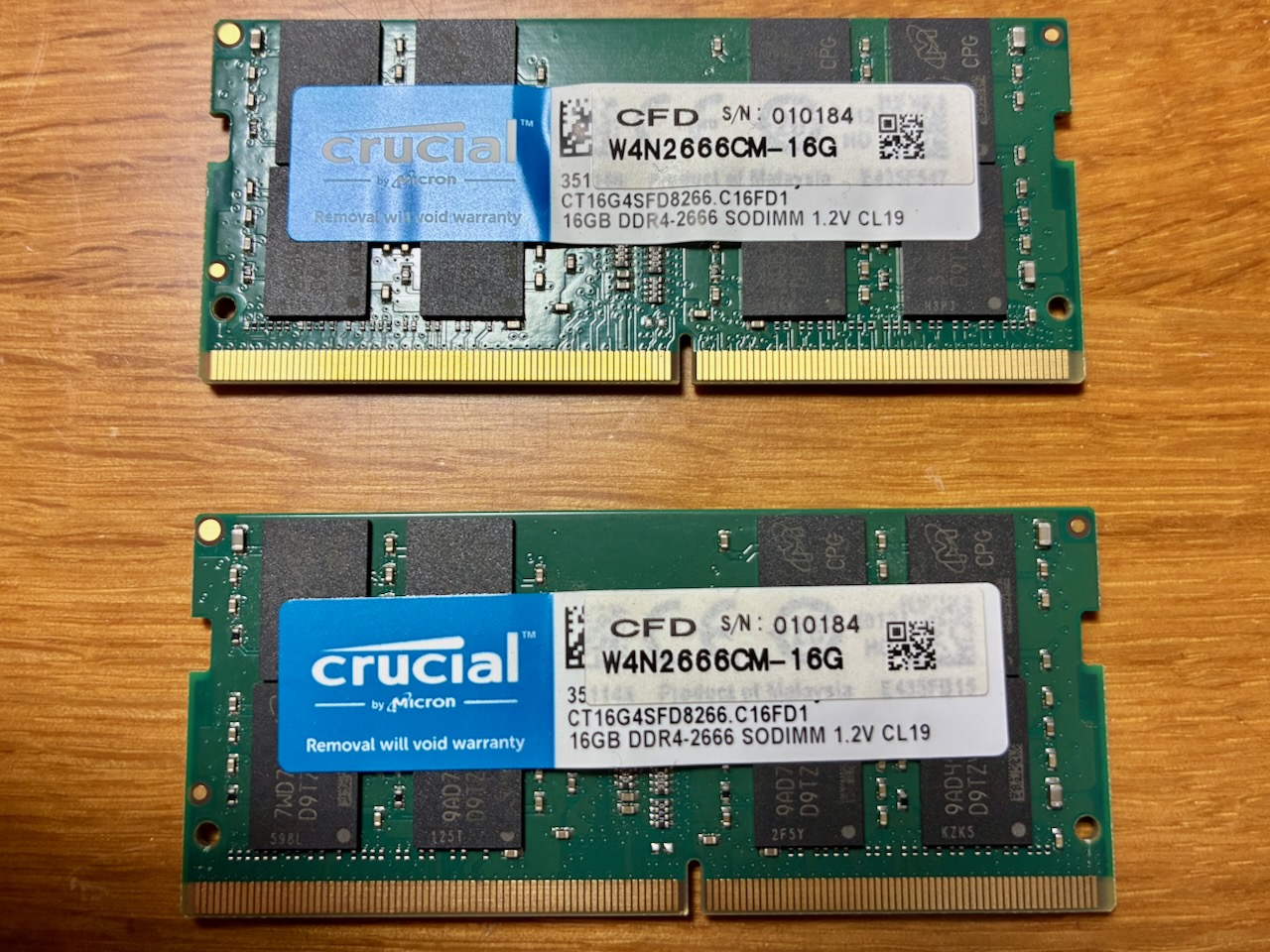 これが取り出したCrucial CFD 16GB DDR4メモリ2枚。Mac mini 2018 (Early 2020) 購入時に付いていた4GB DDR4メモリ2枚を元に戻しました。