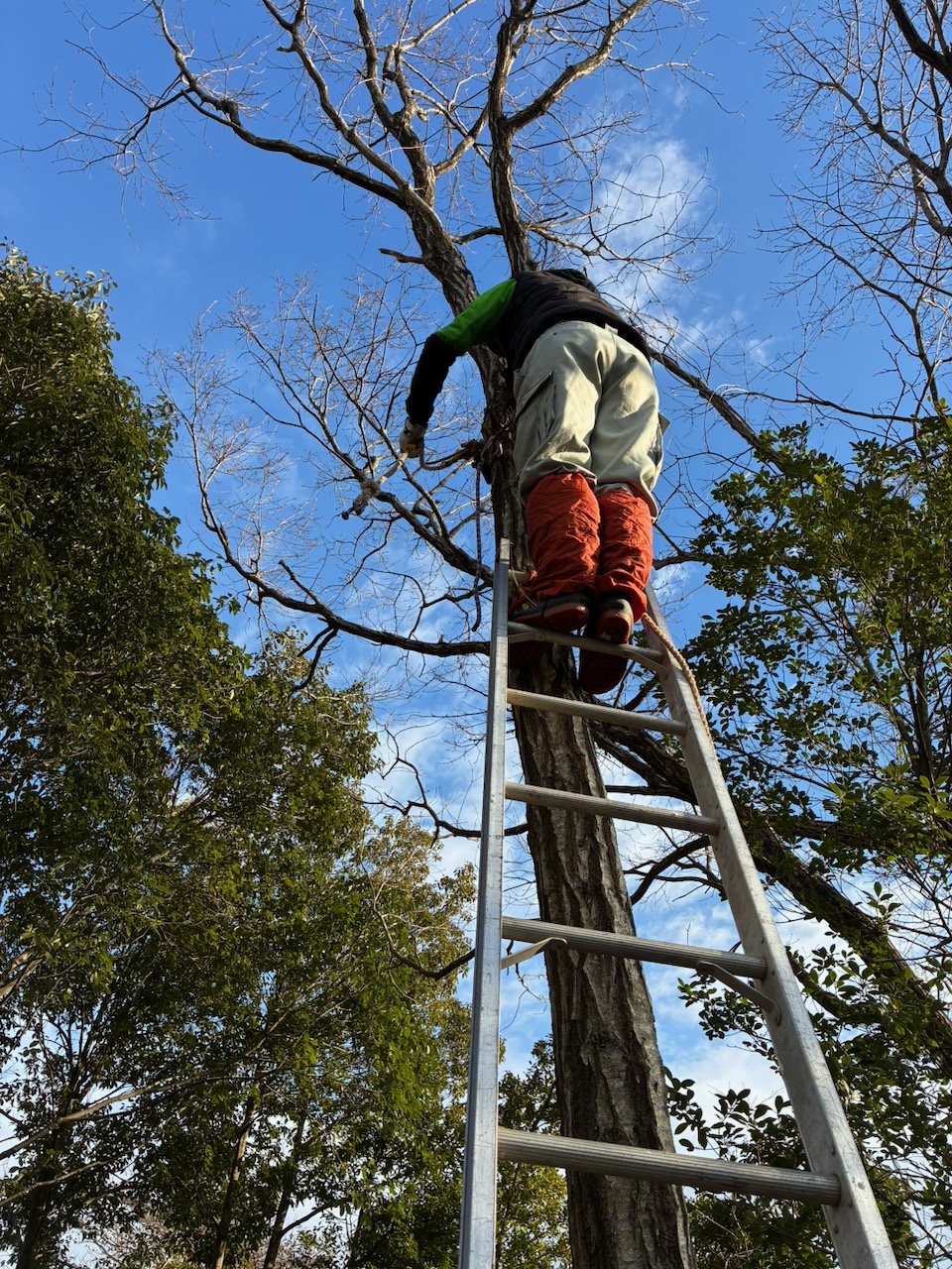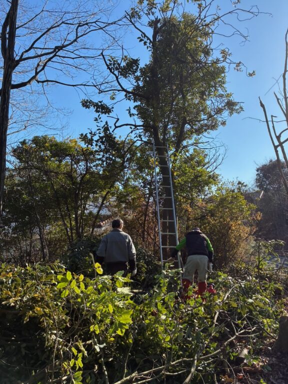 3日ぶりに3人が揃った今日は、敷地外周部の比較的太いコナラとアラカシを3本、伐倒しました。できるだけ高い位置にロープを掛けるには木登り必須ですが、この作業は伐倒師匠に任せることにしています。
