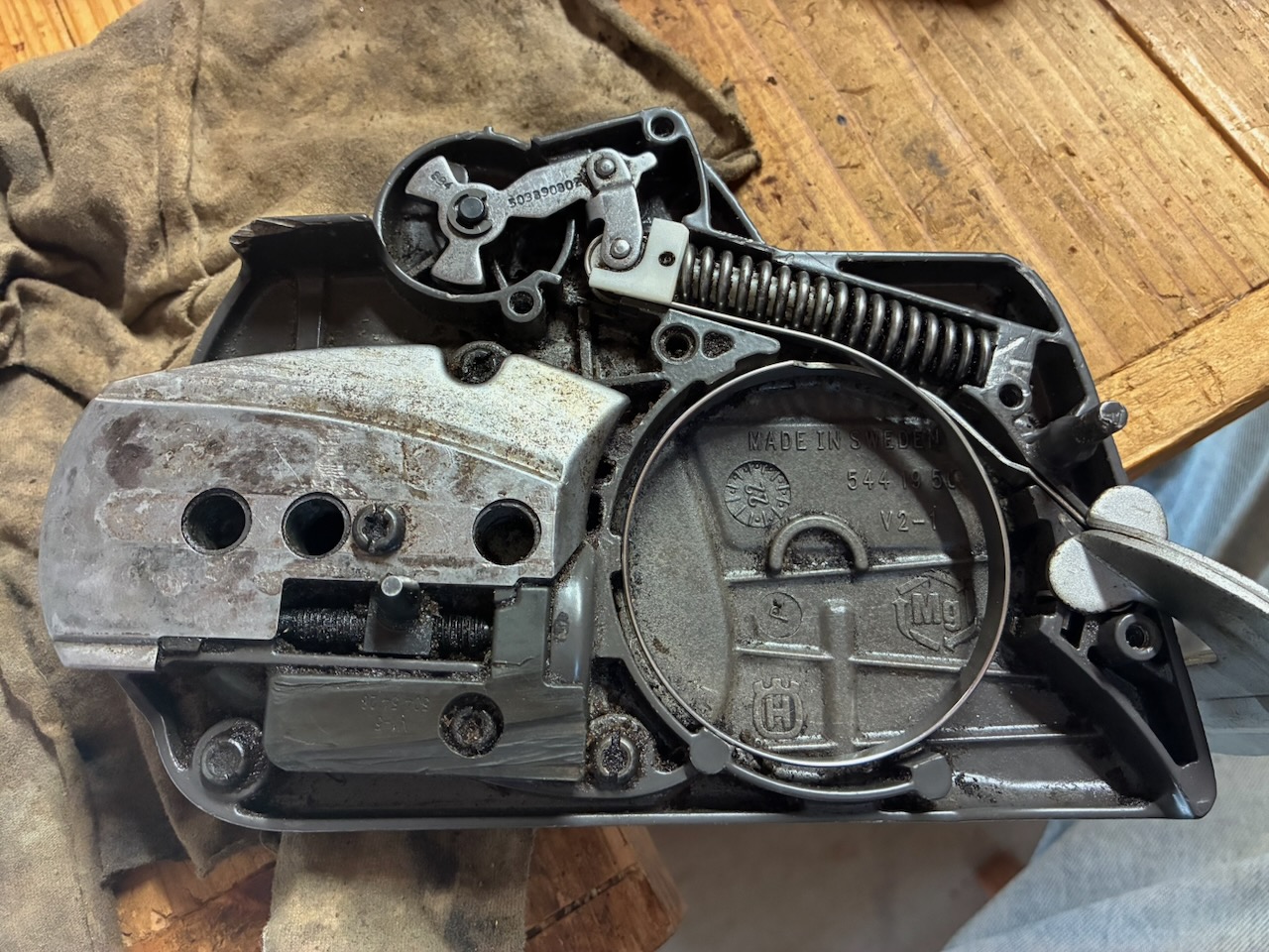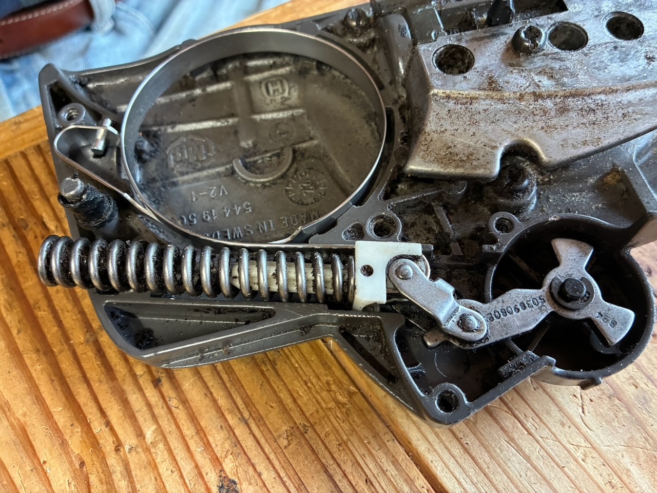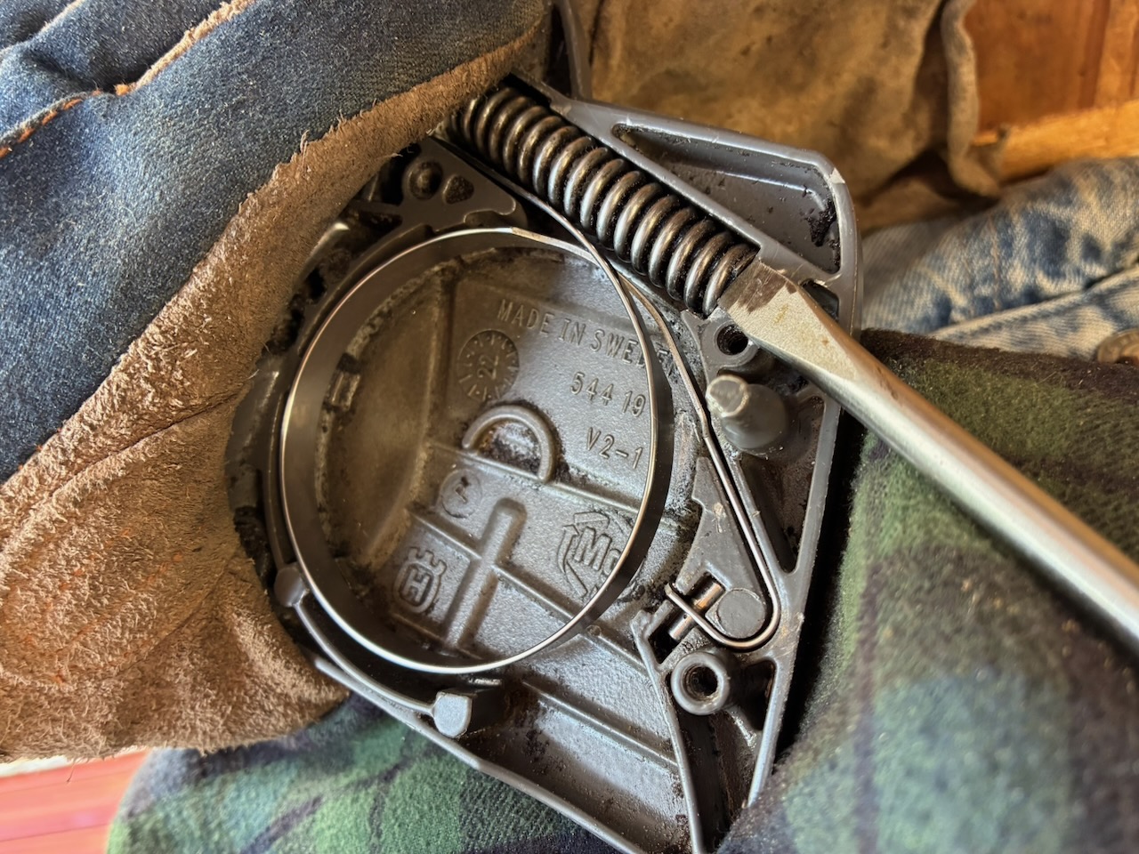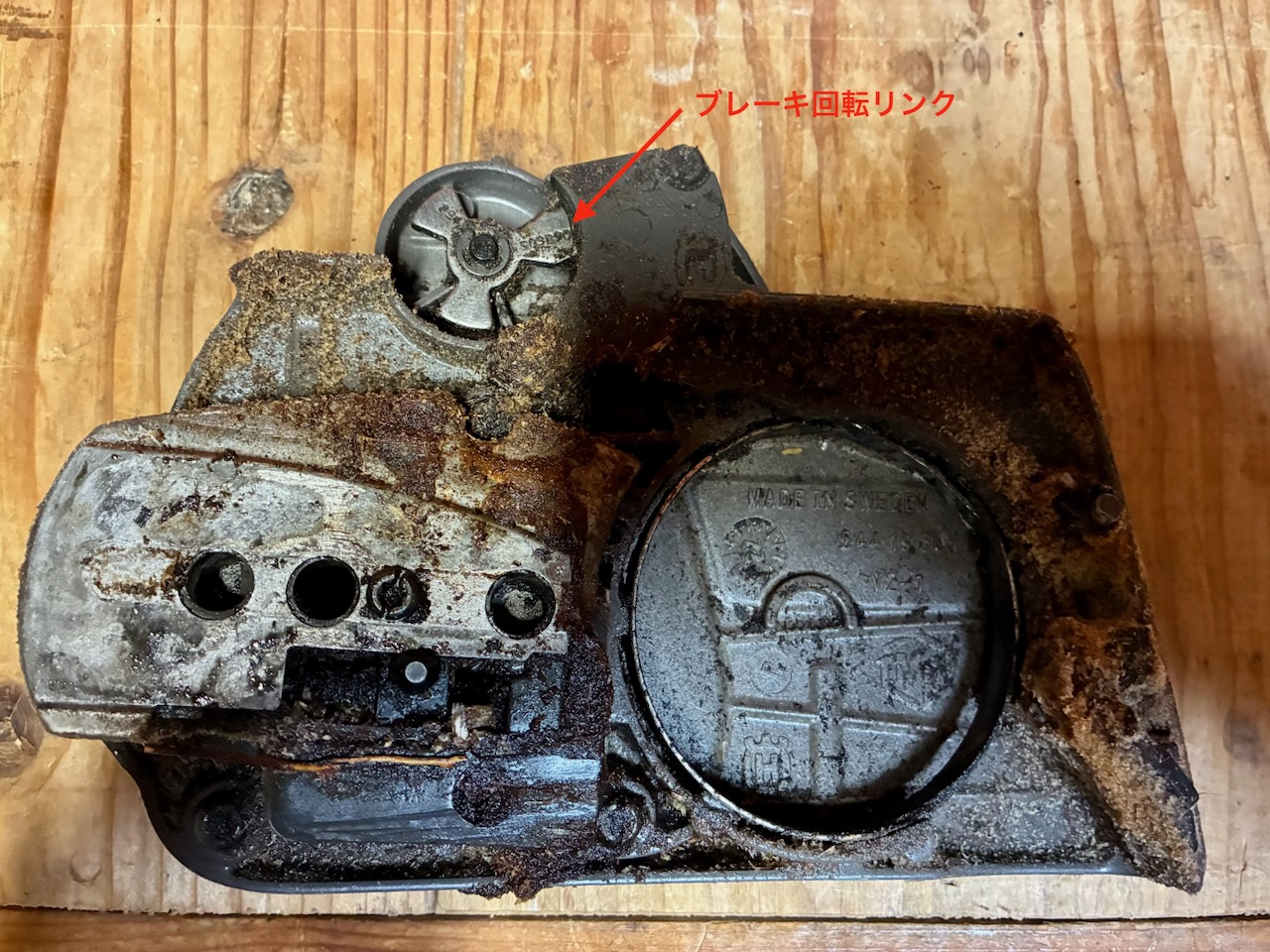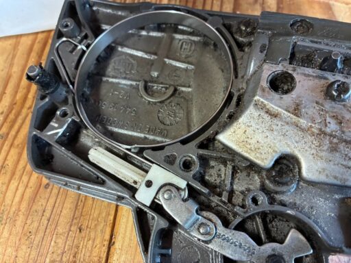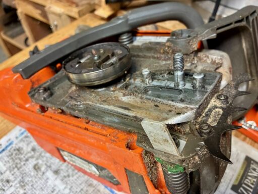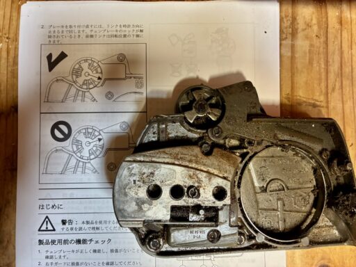 オイル漏れの検証時の試し切りをしていて、チェンブレーキが効いていないことが判明しました。原因はブレーキバンドが切れていることでした。私はエンジン始動時にブレーキをロックさせない使い方をしています。過去25年のチェンソー使用歴で、キックバックが発生してブレーキが効いた経験は一度か二度ぐらいなので、チェンブレーキが効かなくても良いと言えば、良いのですが。しかし、安全性を考慮すると、いざという時にブレーキは働いた方が良いので、修理しようと考えています。