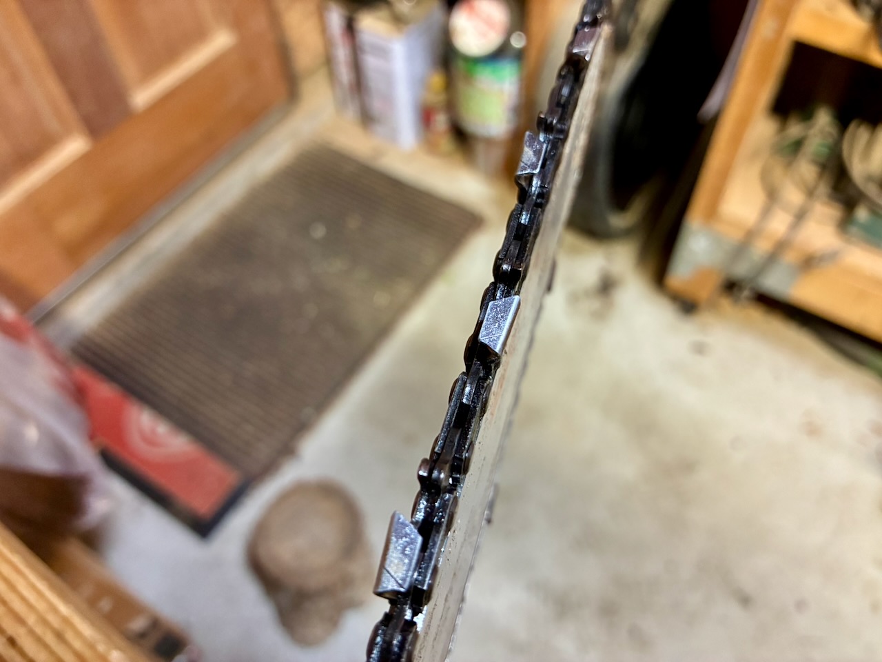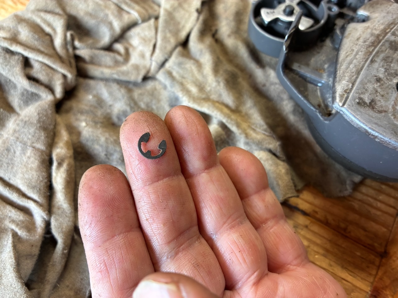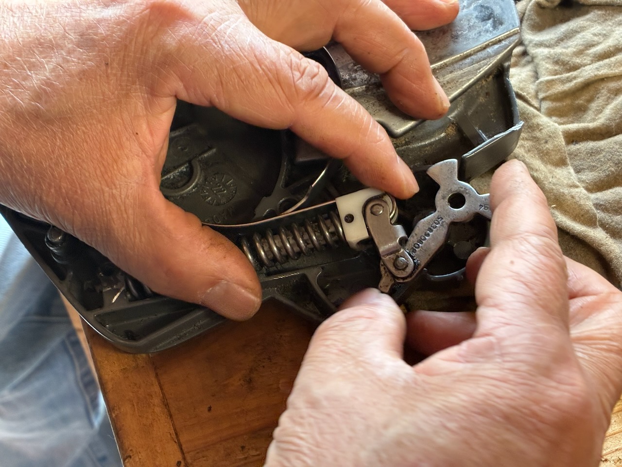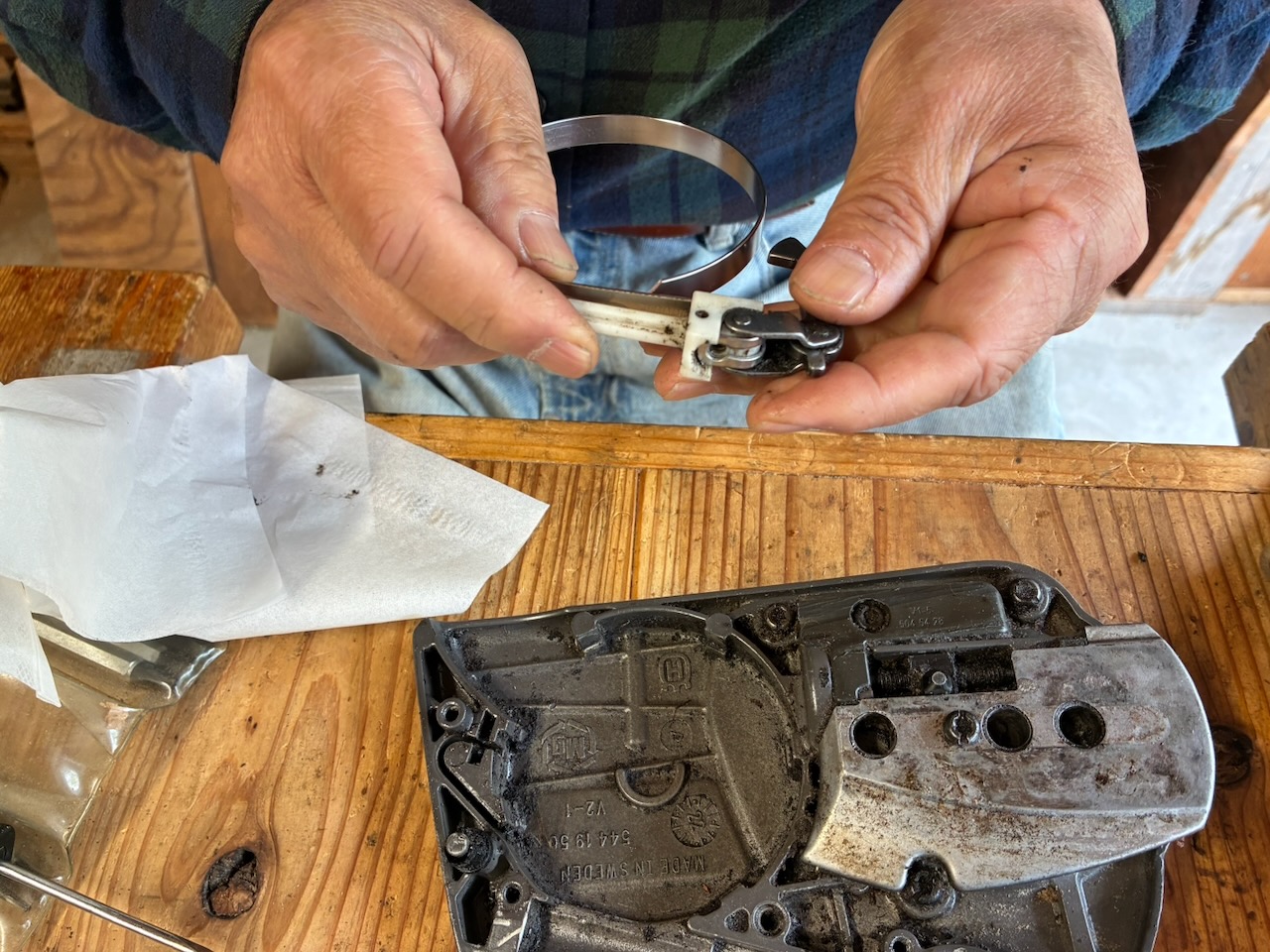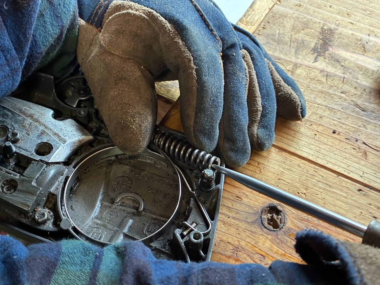 オイル漏れの検証時の試し切りをしていて、チェンブレーキが効いていないことが判明しました。原因はブレーキバンドが切れていることでした。私はエンジン始動時にブレーキをロックさせない使い方をしています。過去25年のチェンソー使用歴で、キックバックが発生してブレーキが効いた経験は一度か二度ぐらいなので、チェンブレーキが効かなくても良いと言えば、良いのですが。しかし、安全性を考慮すると、いざという時にブレーキは働いた方が良いので、修理しようと考えています。