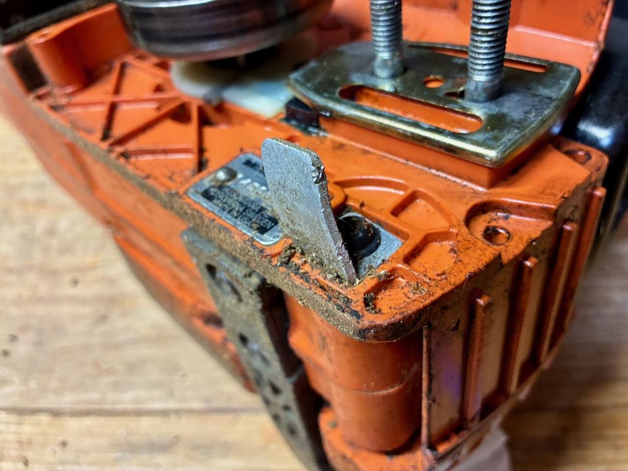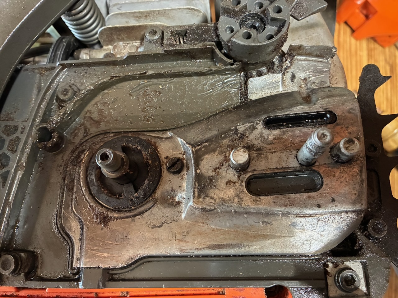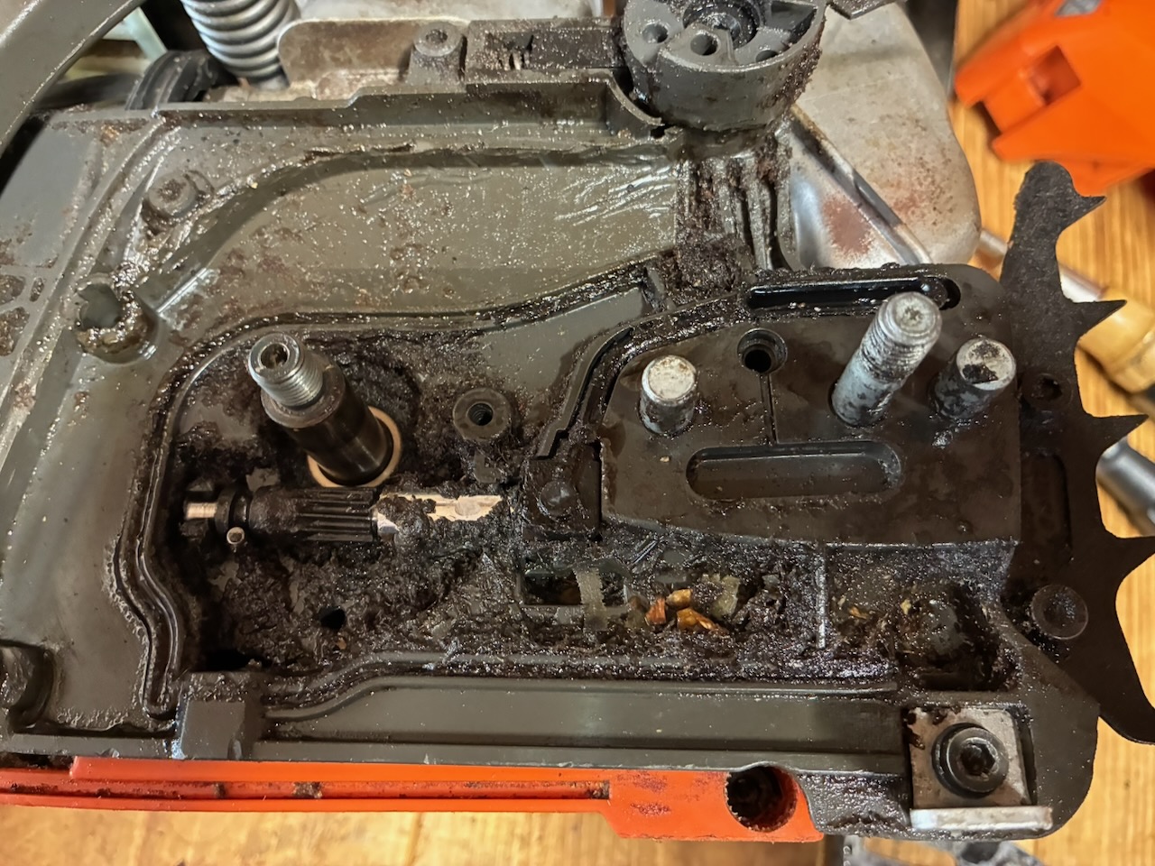 チェンガイドプレートの下には油まみれの大量の切り屑が!この状態ではオイルが詰まるのも無理はない。まずは綺麗にしてから、オイルホース、ポンプシリンダー、ポンプピストン、ウォームギアなどを点検しましたが、それぞれのパーツには異常はなさそう。