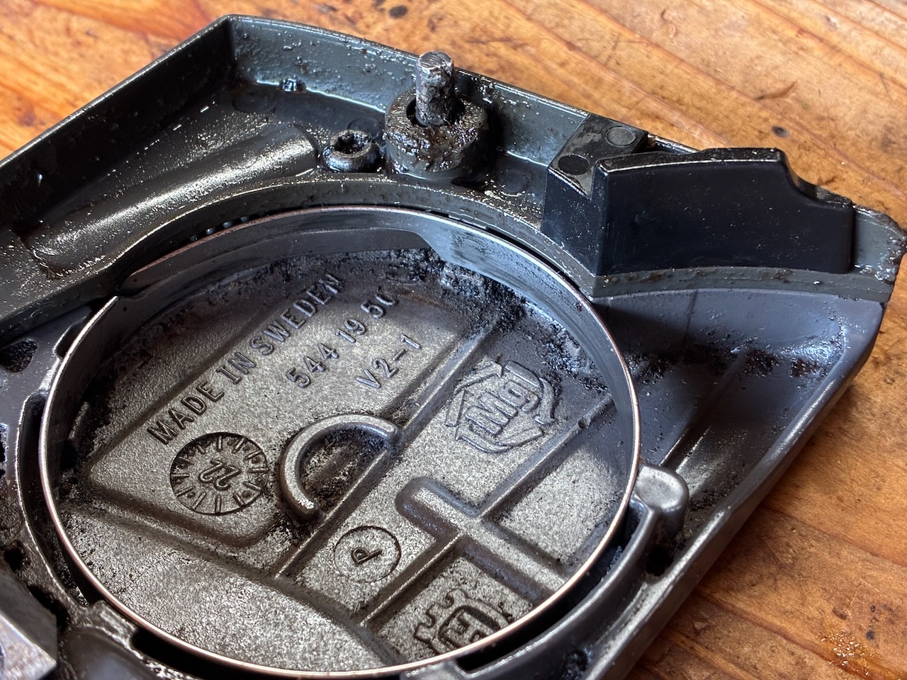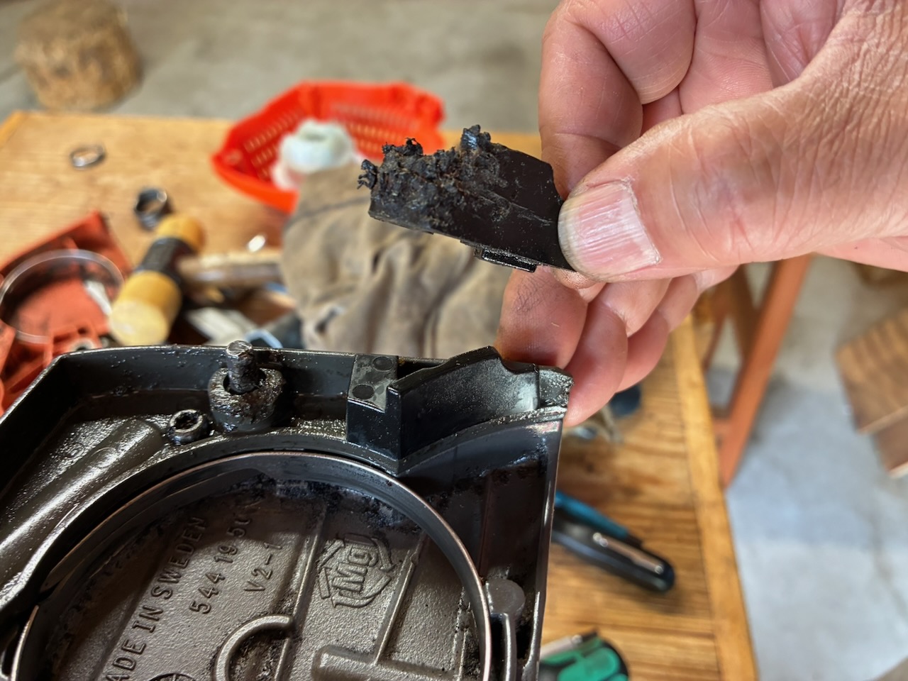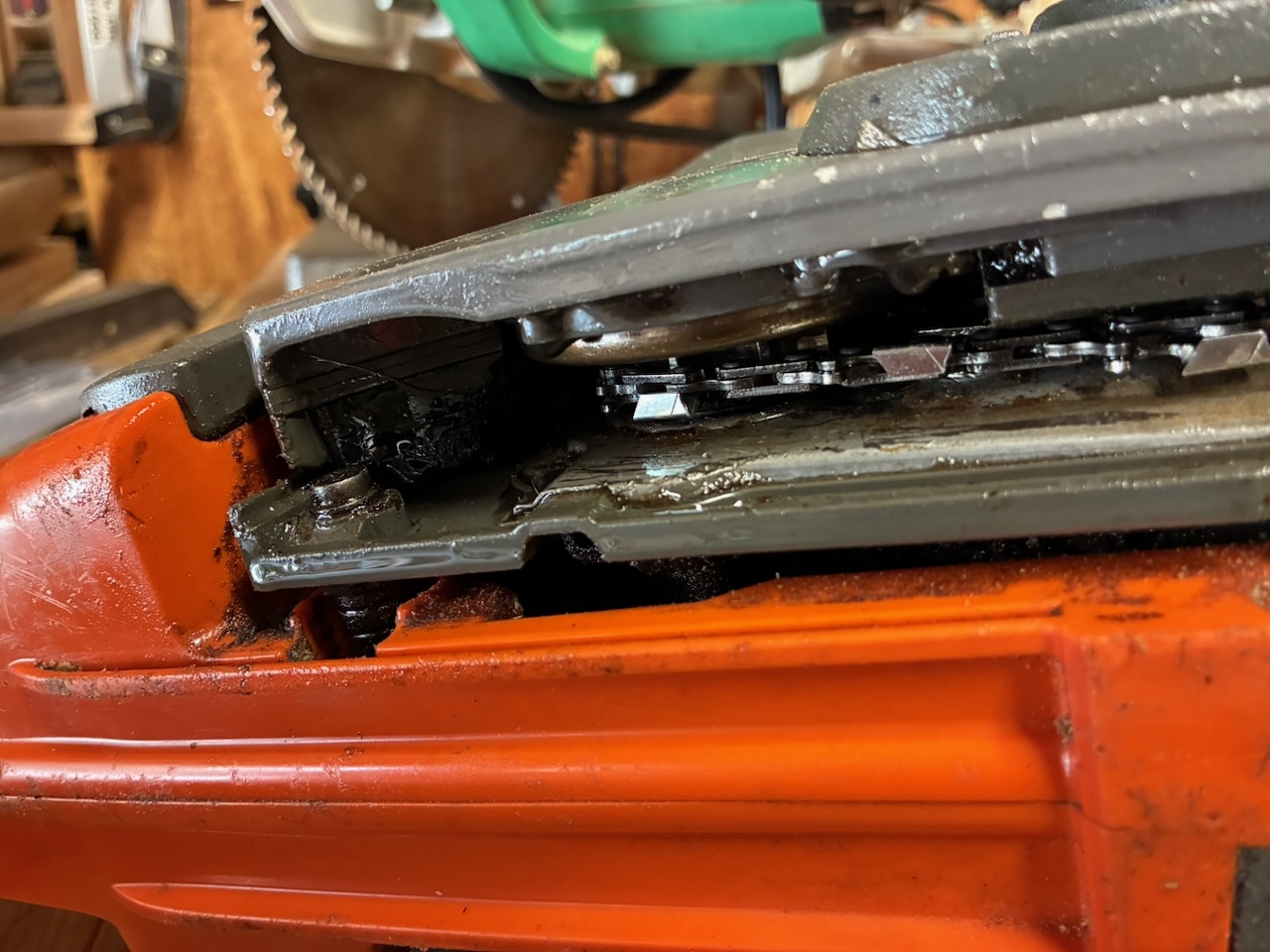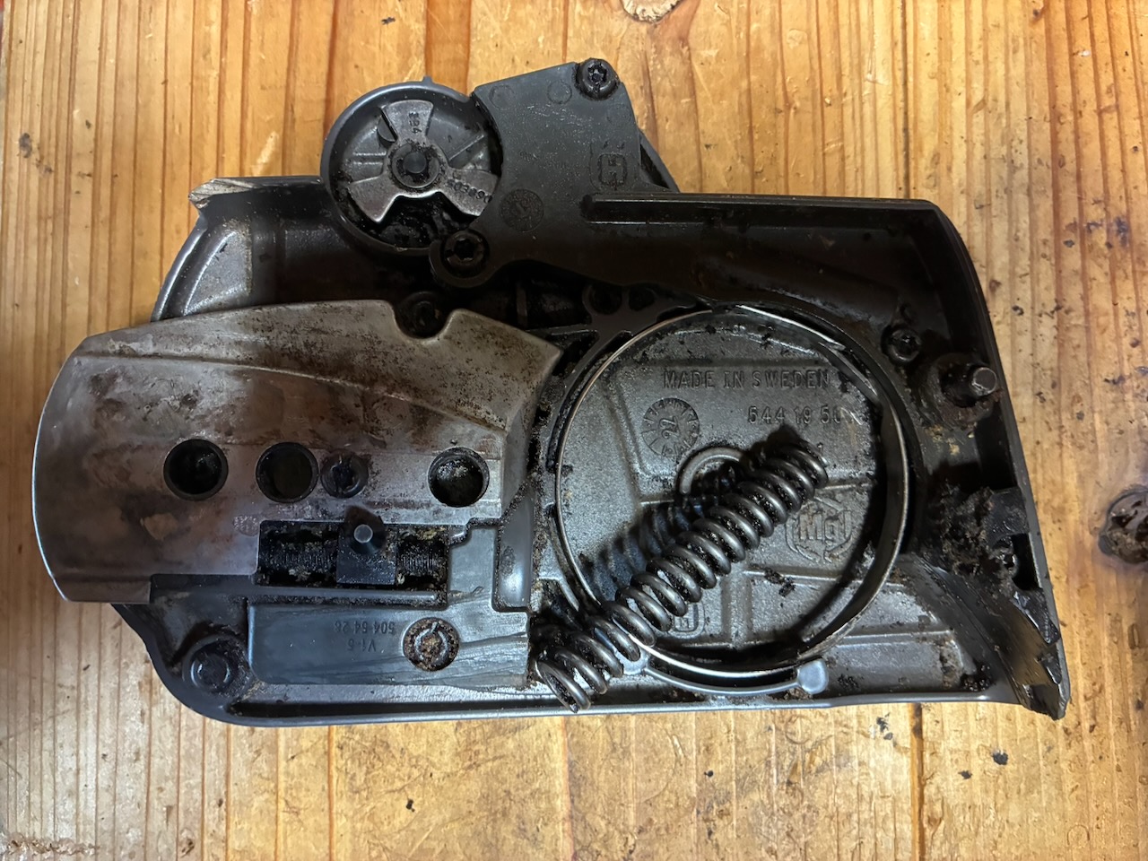チェンガイドプレートの下には油まみれの大量の切り屑が!この状態ではオイルが詰まるのも無理はない。まずは綺麗にしてから、オイルホース、ポンプシリンダー、ポンプピストン、ウォームギアなどを点検しましたが、それぞれのパーツには異常はなさそう。
