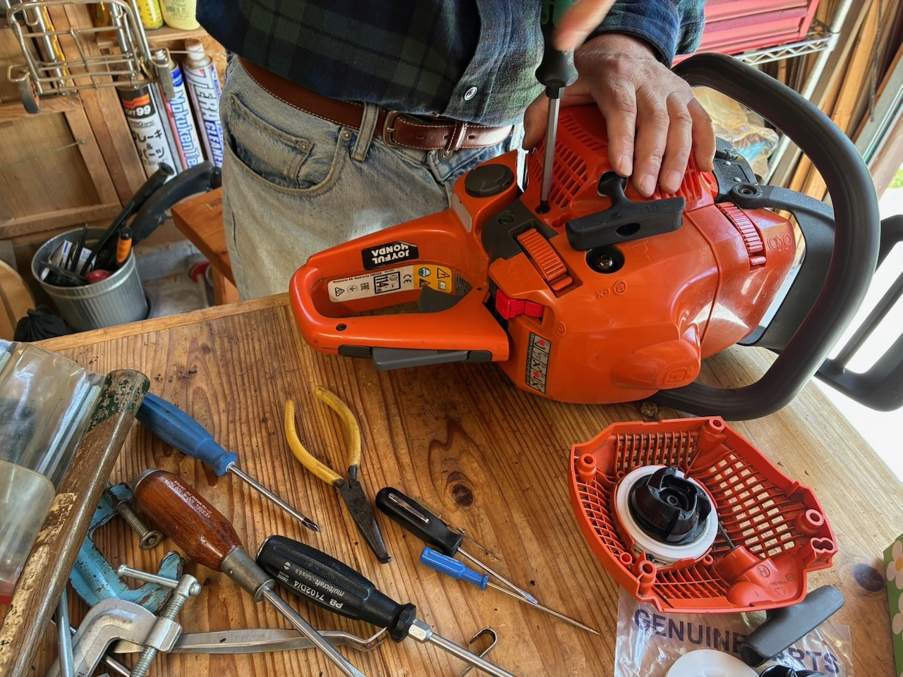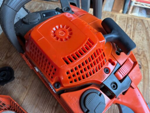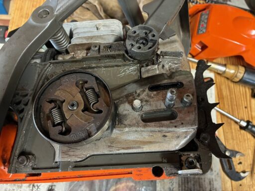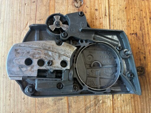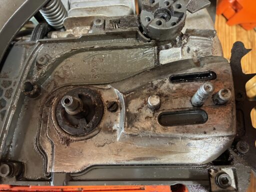 メルカリで購入したこのチェンソー、試し切りしていると、受け取り直後に判明した不具合以外に何点か、別の不具合が見つかりました。そのうちの一つがオイル漏れ。原因を探るにはクラッチカバーを取り外して、オイルポンプ周辺を点検する必要があります。