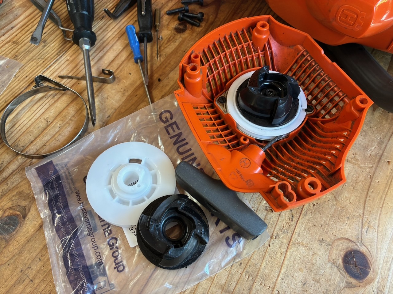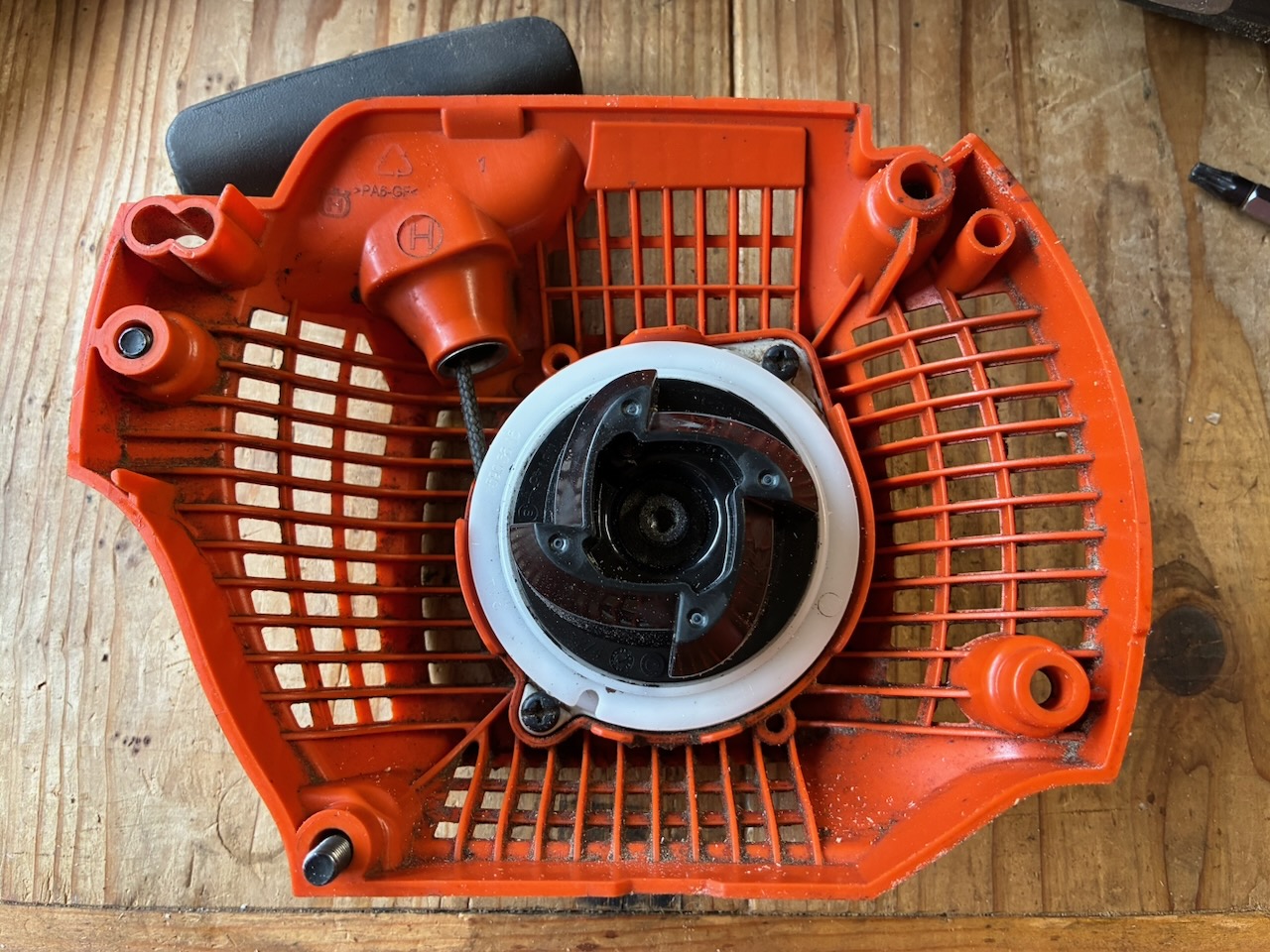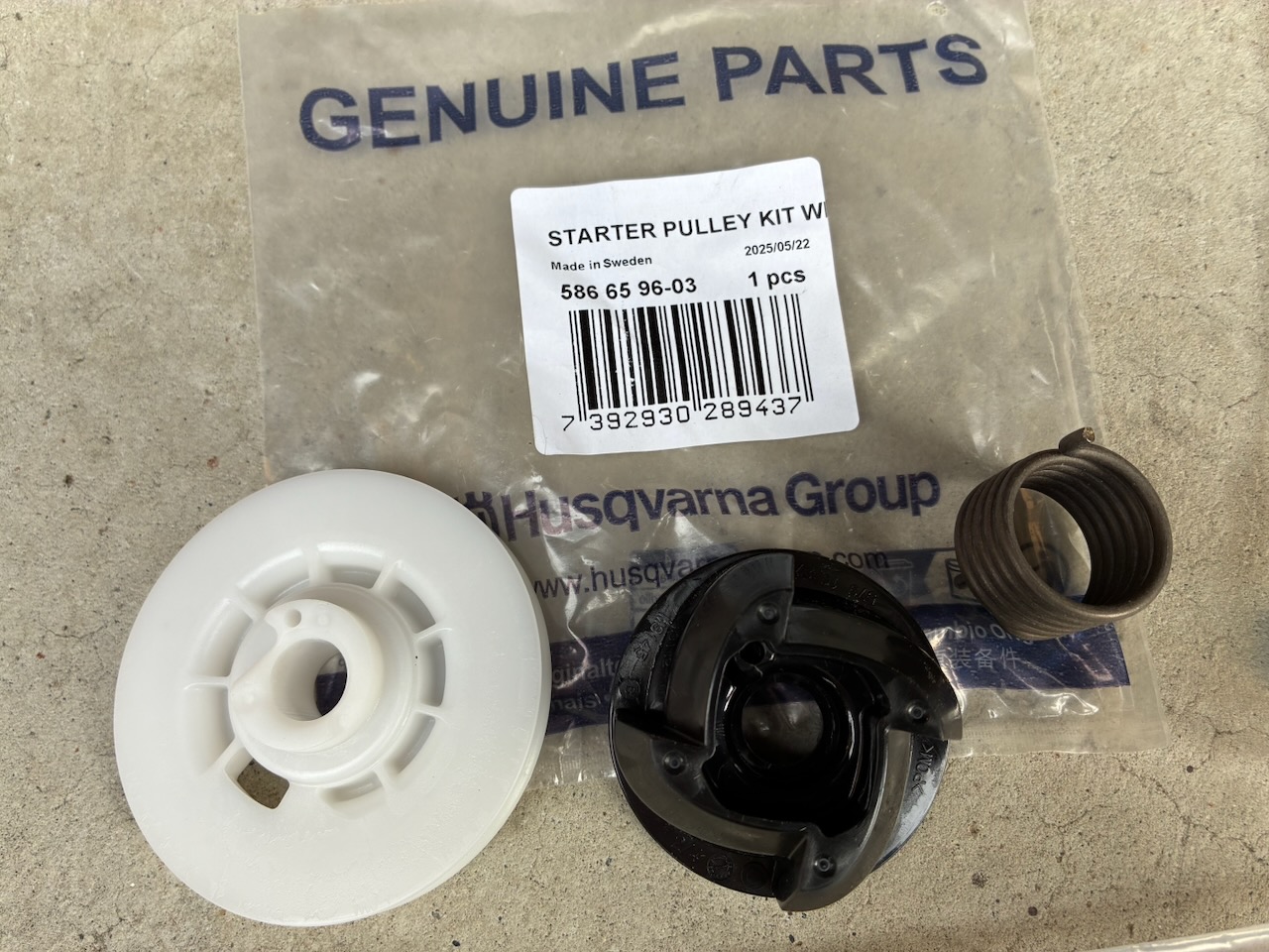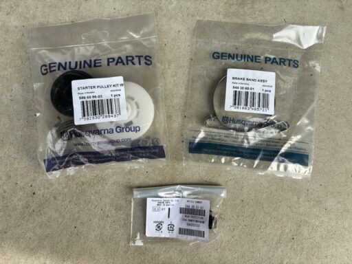 ついでと言えばスタータープーリー(586659603、駿遠商事での価格は3,380円)も交換してスターターを純正に戻そう。このパーツ、スプリング単体では入手できないようです。適合機種は440e IIのみと表示されるので、非純正のスプリングのみを純正スタータープーリーの一部として使用することが不可なのでしょう。