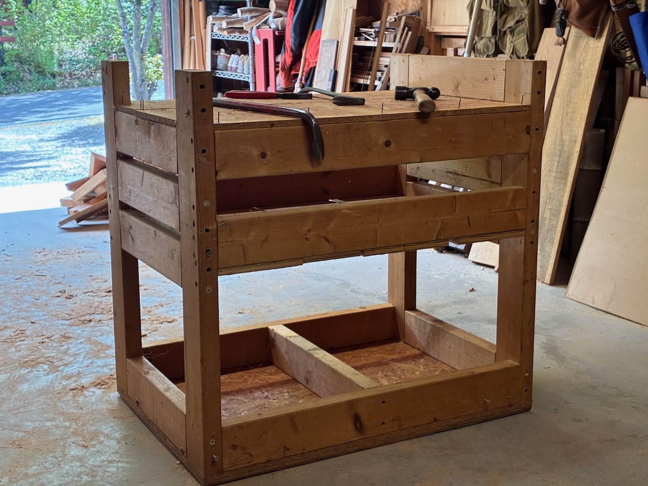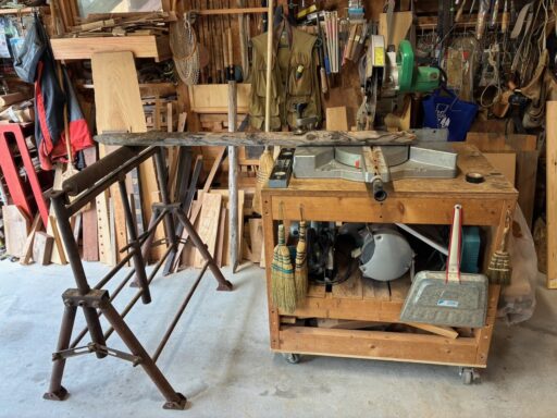 スライド丸鋸専用台の高さをローラースタンドの高さに合わせるために丸鋸専用台の脚部を80〜90ミリほど切断して調整しました。専用台に固定していたスライド丸鋸を取り外し、棚から電動工具を取り出して、重しとして置いていた大量の端材を外に出して、専用台を上下逆にしました。4本の2x4材を短くして、底板を新しいものに交換し、キャスターを元通りに戻しました。