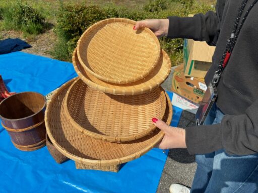 前日の北野天満宮天神さんで見かけたものは一つ、千円と言われて購入を控えた箕が、蚤の市を主催する不思議なガレージさんで、4つで1,000円にしてくれました。