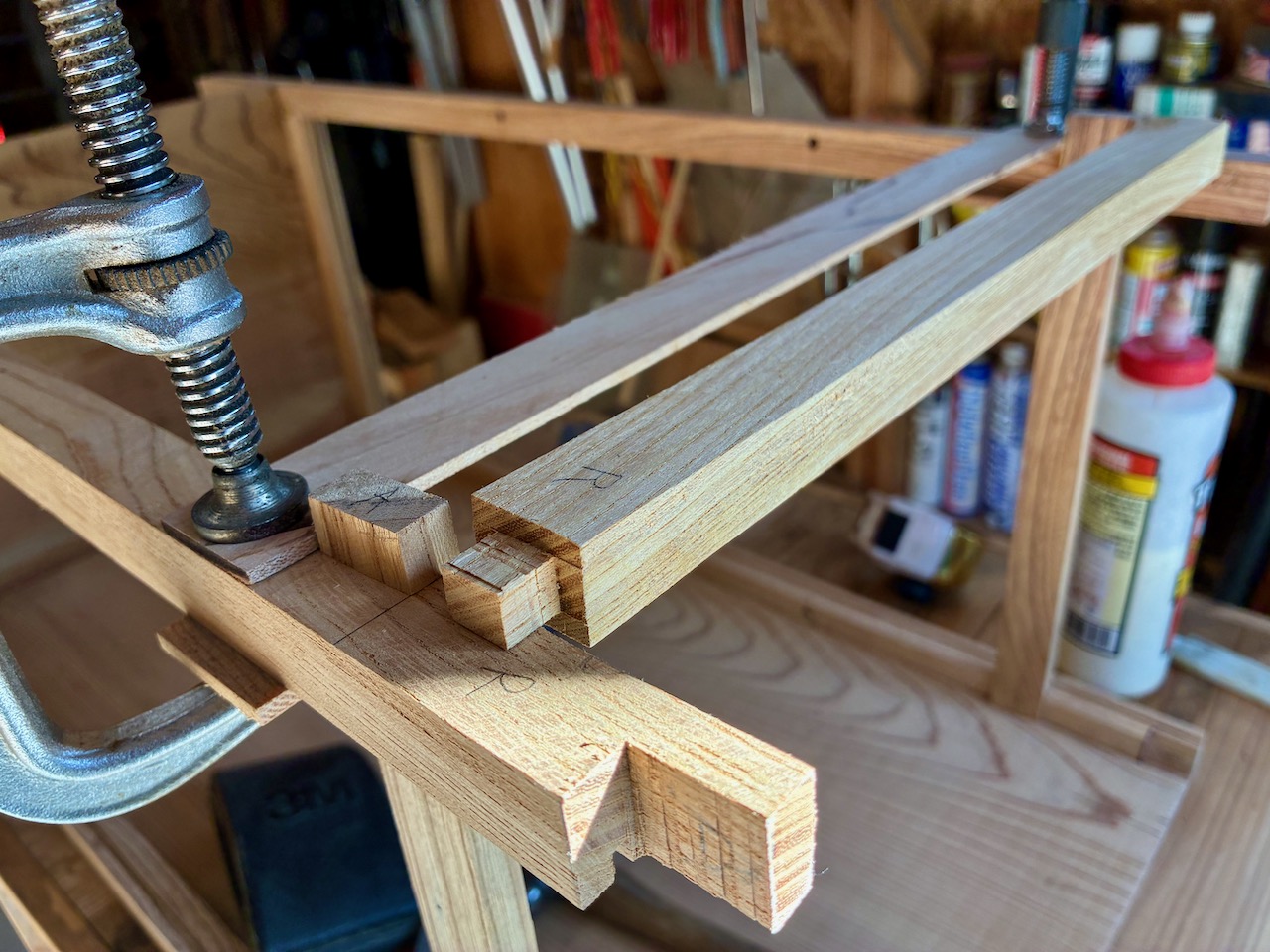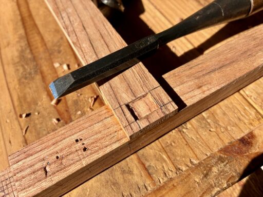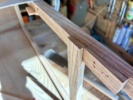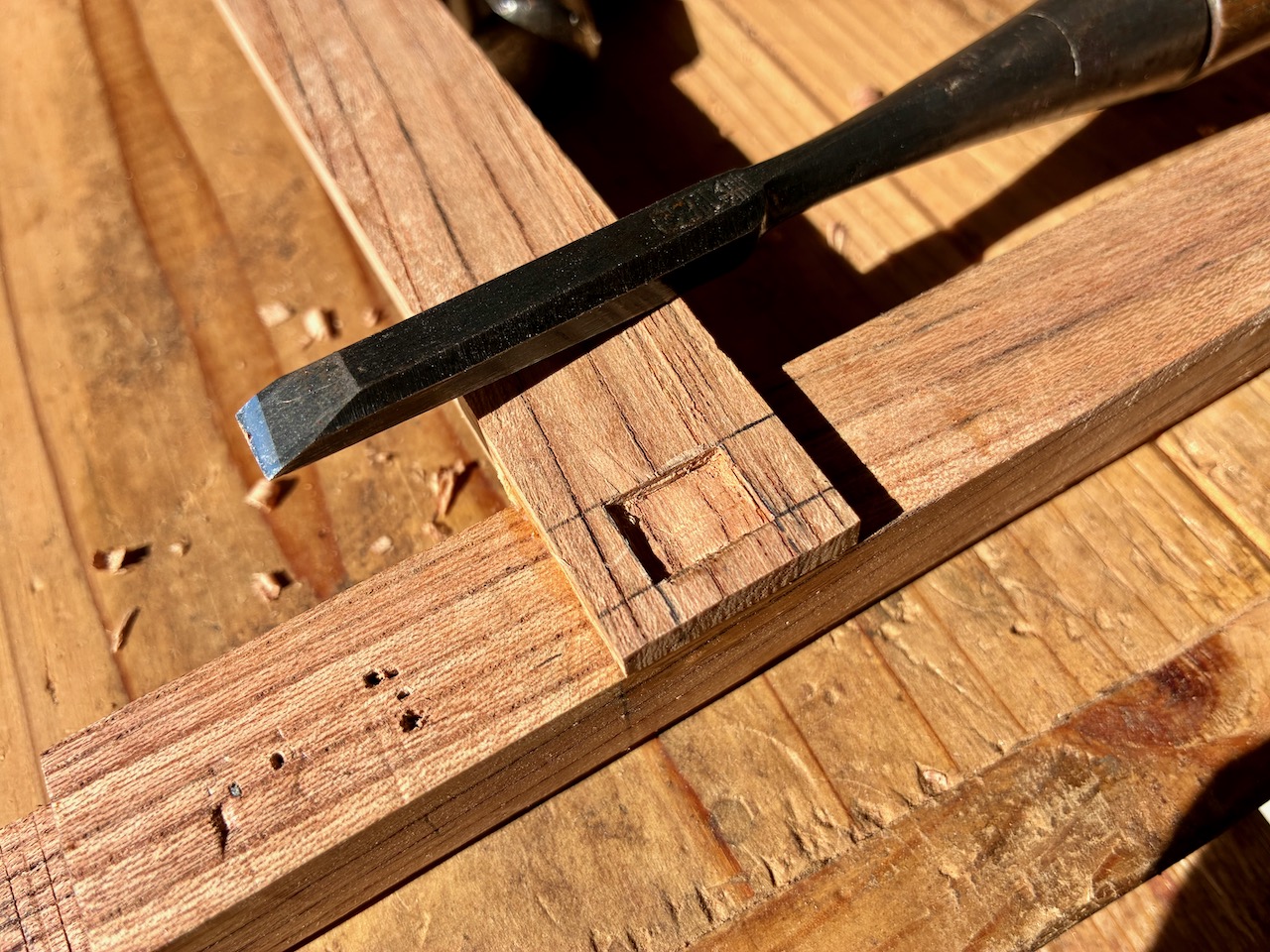 左右の側板を固定する桟を枘組みします。枘は長めに加工してから必要最低限の長さになるように、徐々に切断して短くしました。