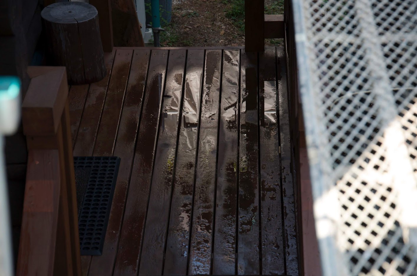 デッキ部分の再塗装も完了しました。使用した塗料はアサヒペン、ウッドガードのチーク。キシラデコールと比べると光沢があり、木材表面の処理によっては薄い塗膜を形成します。