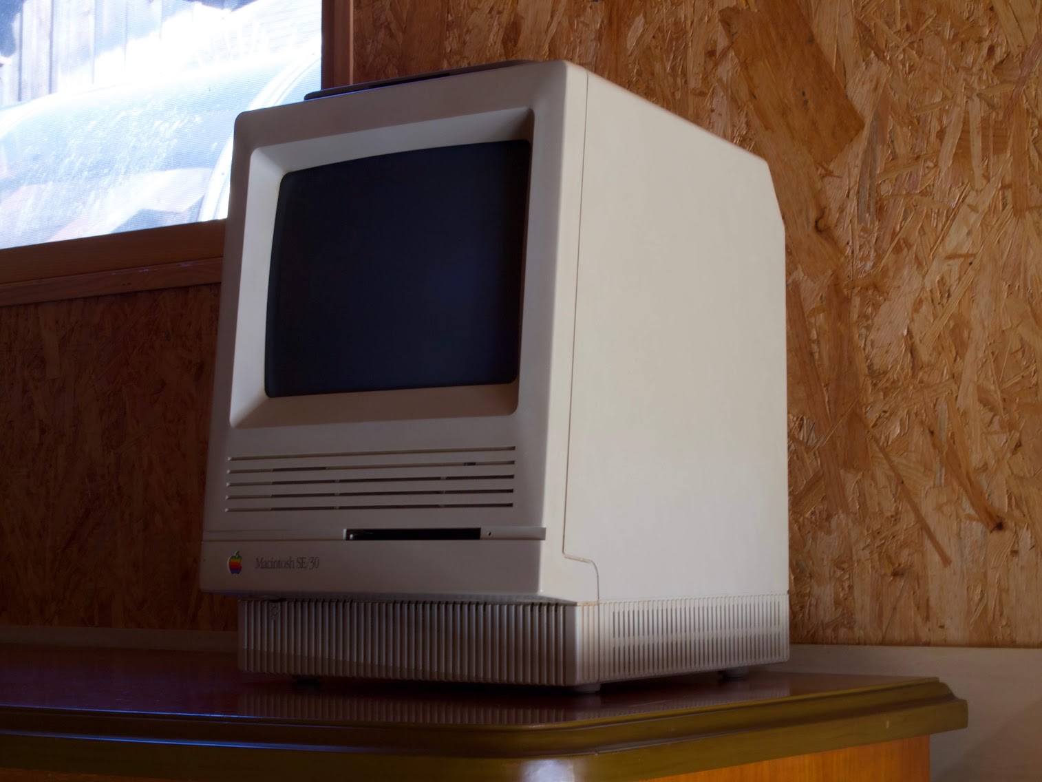 手元にある、現役を退いた歴代Mac、Apple製の周辺機器をすべて、ガレージの片隅に陳列しようという計画です。その一台目がこのSE/30。ガラス用洗剤を用いて汚れを軽く落としましたが、満足できるような状態ではありません。コンデンサが故障しているので、起動することができないのが残念です。