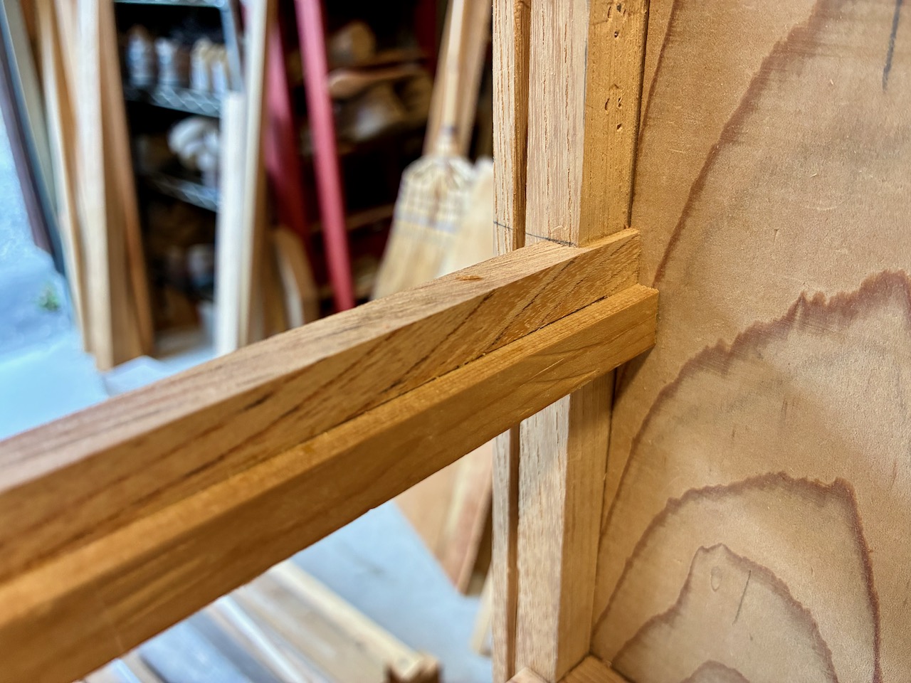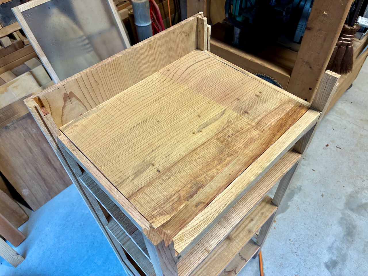 最上段の棚は高さが低くなるので、棚板を載せるか迷いましたが結局、棚を載せることにしました。桟の内側に棚受けを木工接着剤とステープルで留めました。