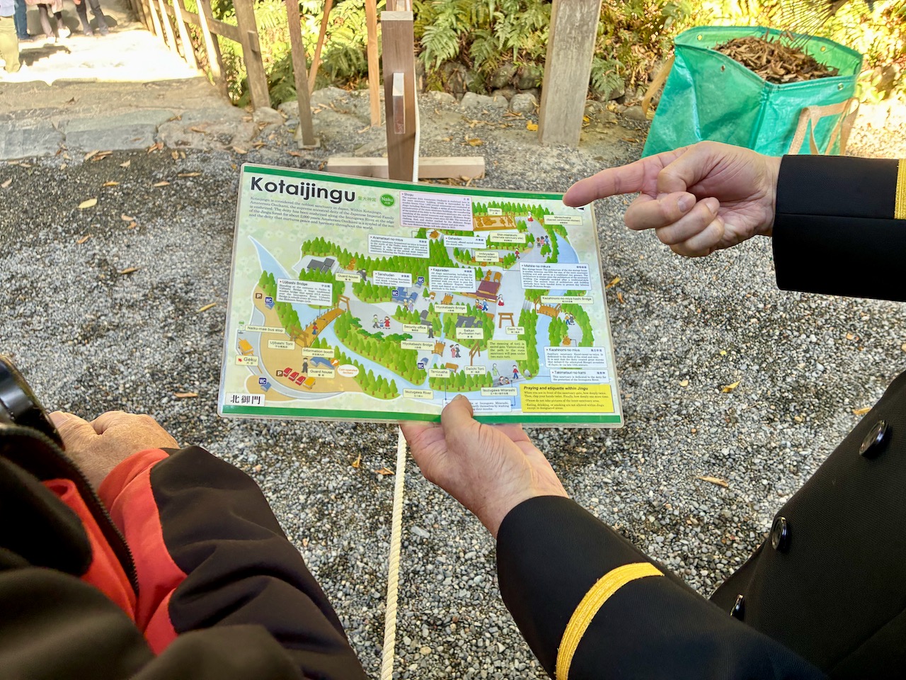 誰か詳しそうな人で、話しかけることができそうな人に聞かないとわからないかなと思いながら、半ば諦めて正宮の北隣にある荒祭宮方面に向かって歩いていると、落ち葉を掃除している職員さんがおられました。
