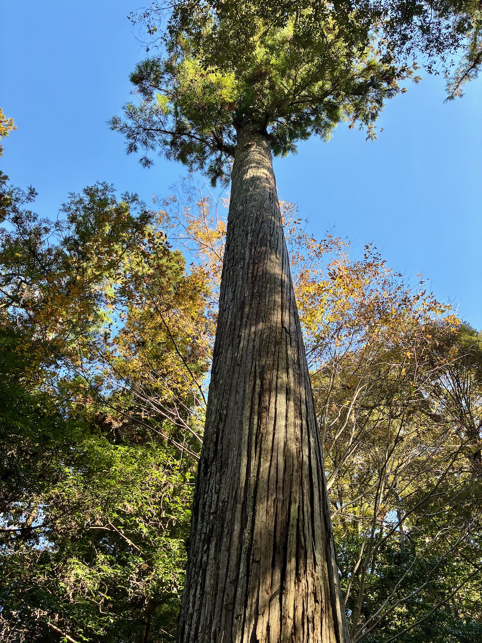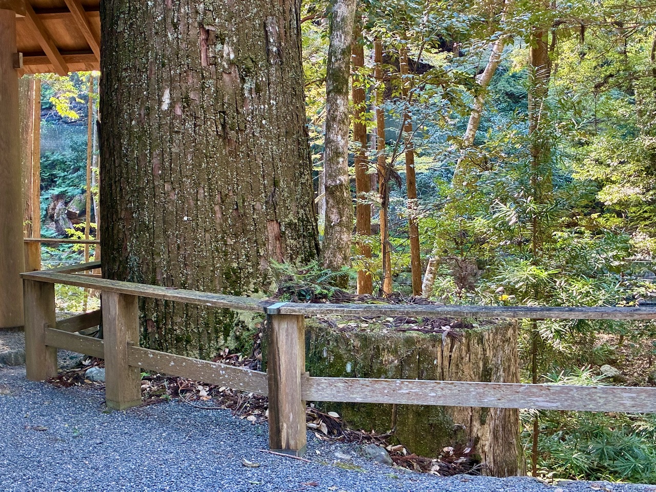 近くから見ると窪みの淵に樹皮が残っているのがわかります。2009年10月10日の中日新聞記事によると推定樹齢800年の神宮杉(御山杉)は高さ約40メートル、根元近くの直径約3メートルということですからここで間違いないと思います。