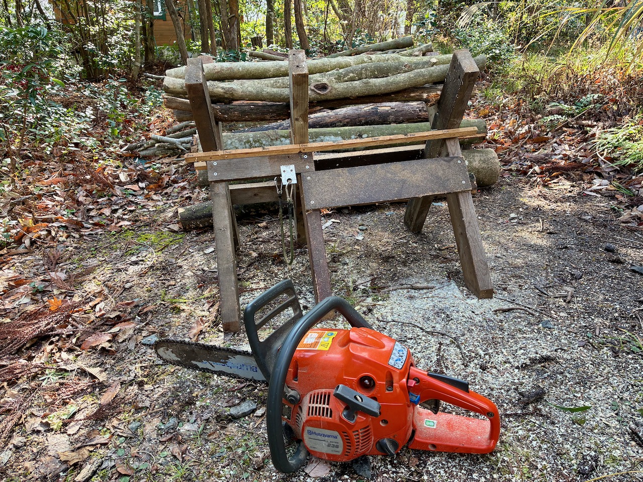 午前中は道を挟んだお向かいさん別荘宅に一時的に置かせていただいている細めの樫を40センチの長さになるよう、チェンソーで玉切りしました。