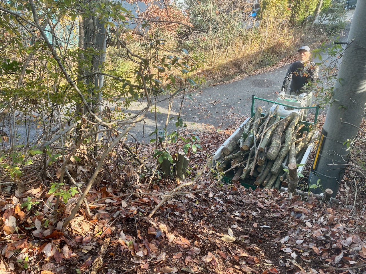 午後は今季の作業現場でこれまでに伐倒した木を搬出する作業の続き。地鎮祭もどきの後、お休みされていた木工師匠も作業に復帰されました。