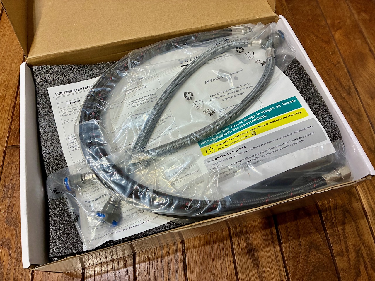 止水栓の方が米国仕様の3/8″、蛇口に接続する方がM10で、長さ24″の給水/給湯ホースが付属しますが、ホースが短いので以前、別途購入した長いホースを再利用します。