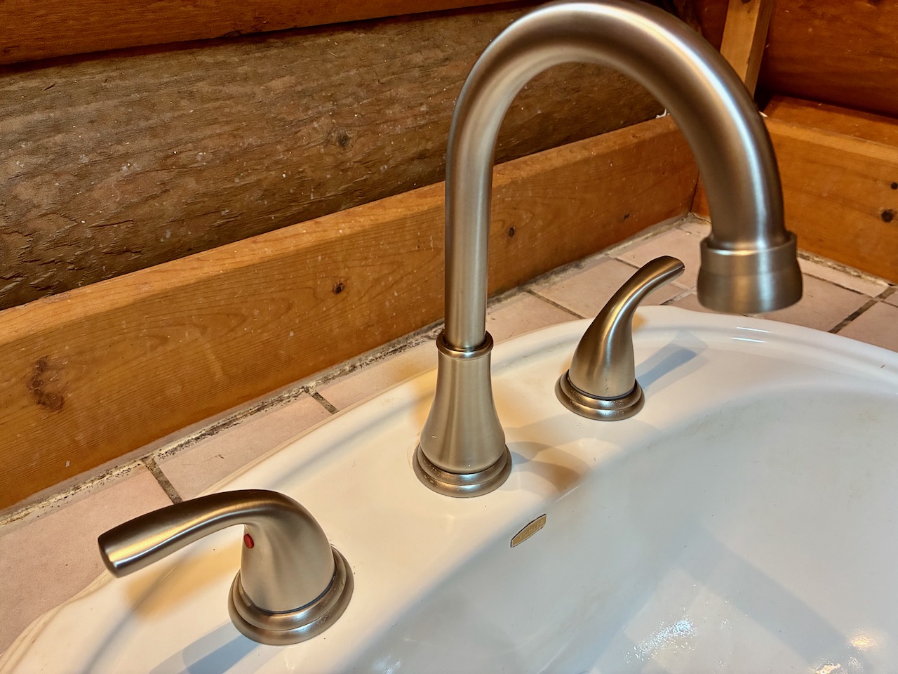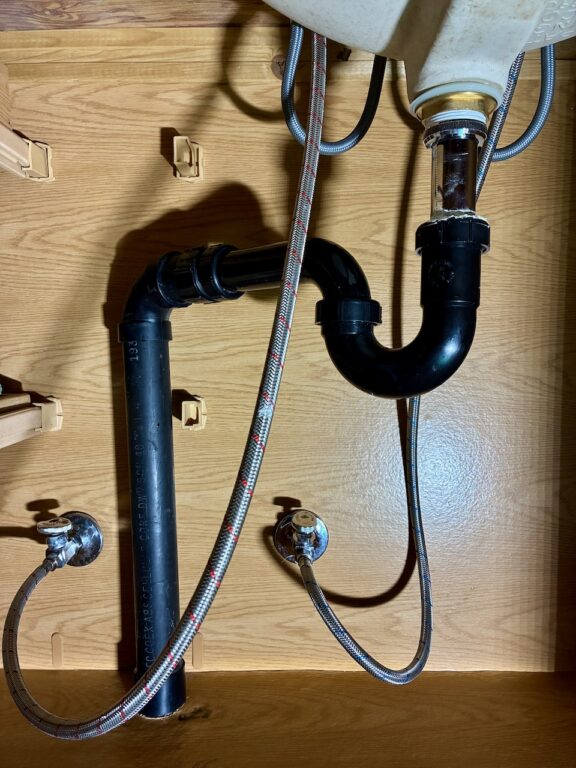 洗面台下の壁面にある米国仕様の止水栓が洗面台よりもかなり左の方にあるので標準サイズのホースが届きません。