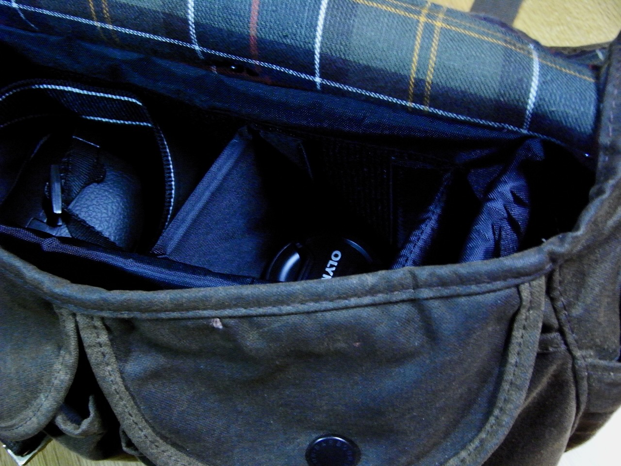 灯台下暗しとはこのこと?カメラ用のバッグをずっと探していました。こちらのバッグもデザインは良いのですが、高級すぎて普段の使用には使いにくい面があります。使い勝手と自分の好みに合うバッグがなかなか見つからずにいましたが、普段使っているBarbourのタラスにエツミのクッションボックスを入れるという案が突然、浮上。早速、いつものカメラ屋さんで、一つだけ売っていたクッションボックスを買ってきました。タラスの中に入れると上下はぴったり。左右に若干、隙間が出ますが、コンデジを入れるとこれまたサイズがぴったり。クッションボックスにはOlympus E-520標準レンズキット(Zuiko Digital ED 14-42mm)と望遠レンズ(Zuiko Digital ED 40-150mm)を収納、レンズフードも余裕で入りそうです。