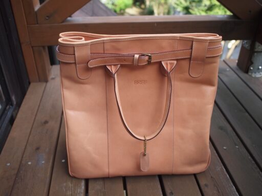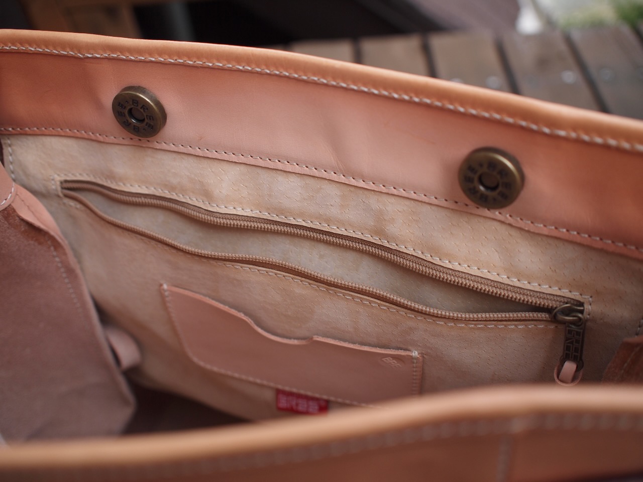 去年の夏に購入したTop Petiteと比べると、同じヌメ革とは思えない純白状態。この状態では使用できません。BREE公式サイトの表現を引用すると、「使用前のヌメ革は、例えるなら生まれたての赤ちゃんの肌。使い込むにつれ色ツヤが深まり表情を変え、唯一無二の個性を持った世界で一つだけのバッグになる。」