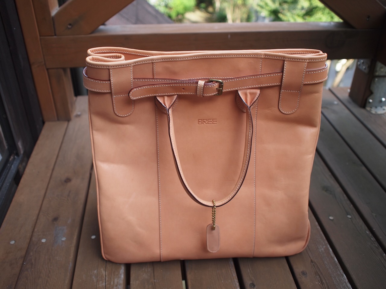BREEのヌメ革バッグは中にものを入れなくても床においた時に自立するというのが一つの特徴かと思います。購入後、まだ10日ほどしか経っていませんが、既に使用を始めました。晴れた日はベランダで日光浴をさせているので、良い色に焼けてきました。と言ってもまだまだきつね色です。このショルダーバッグは、「Olympus PEN E-P1パンケーキ専用カメラバッグ」と勝手に名付けました。