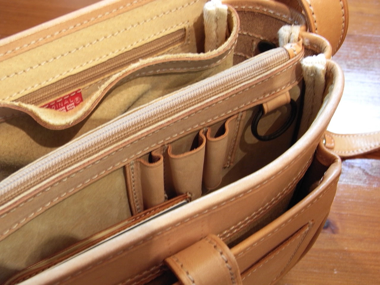 BREEのヌメ革バッグとしてはめずらしく、小さなポケットがたくさんありあります。(ポケットは全部で8個?)外側にジッパー付きの背面ポケットが一つ、ボタン式のフロントポケット一つ、カードケースが一つ、フラップを開けた内部は仕切りで3つのコンパートメントに分かれていて、ジッパー付きのポケットが2つ、ペンホルダー3本分、キーリングとキーストラップも付いています。フラップ内側にはマグネット式のボタンが付いています。5段階に調節可能なショルダーストラップには、BREEロゴ入り肩パッドとD管付き。ライナーは柔らかいピッグスキンですから、カメラを傷つけることもありません。