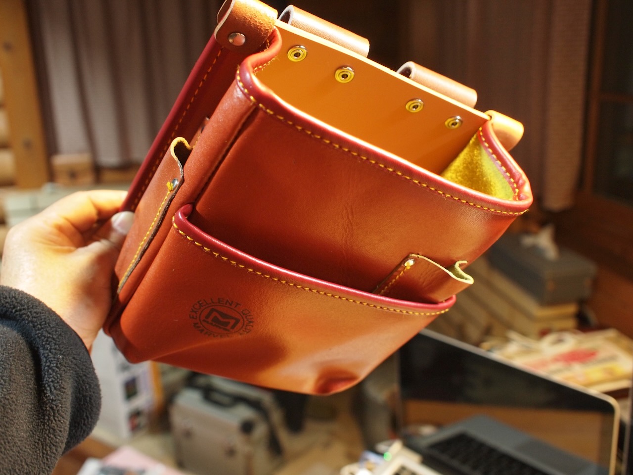電工用のプラスとマイナスドライバーが付いて何と¥980。フロントポケットの部分は合成皮革のようですが、それ以外はすべて本革です。丈夫そうですが、本来の用途で使用するつもりはありません。