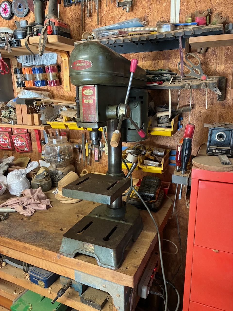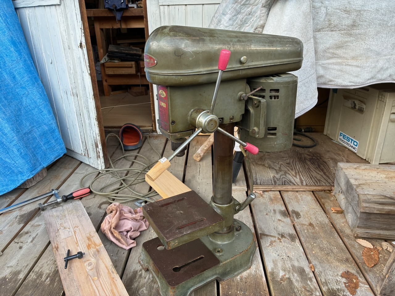 西門から境内に入って最も遠い場所で出店されている、品数豊富ないつものおじさんの店に真っ直ぐ。目に留まったのがこの小型の卓上ボール盤。これまで私はボール盤を所有したことがなく、安く手に入れることができるのなら欲しいなあと思っていました。