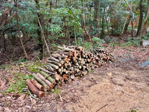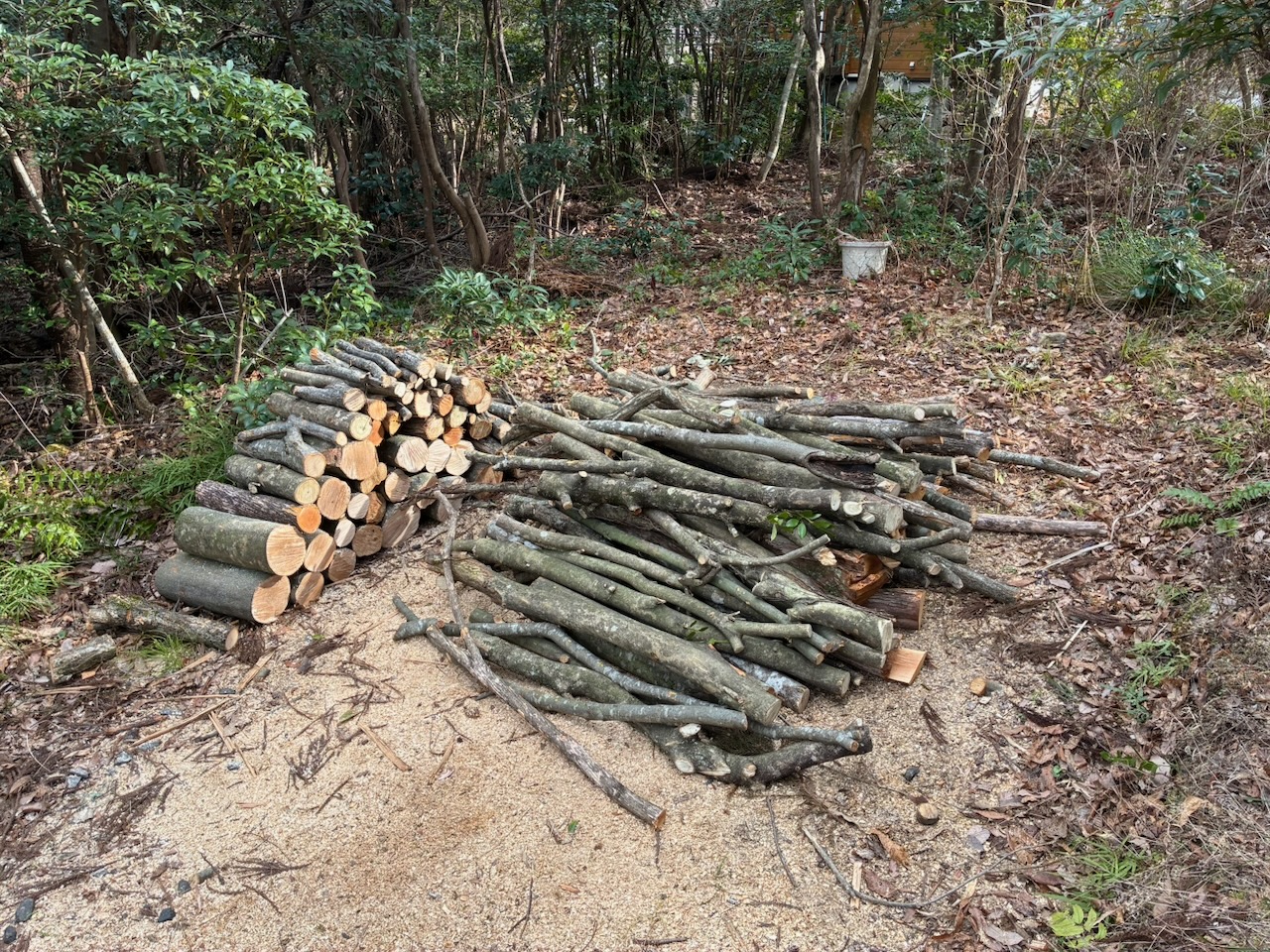 近所で庭の管理をされている庭師の方から伐採したコナラを大量にいただきました。軽トラの荷台一台分以上はある量です。道を挟んだお向かいさん別荘宅敷地内に運んでくださいました。