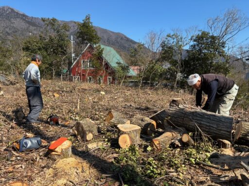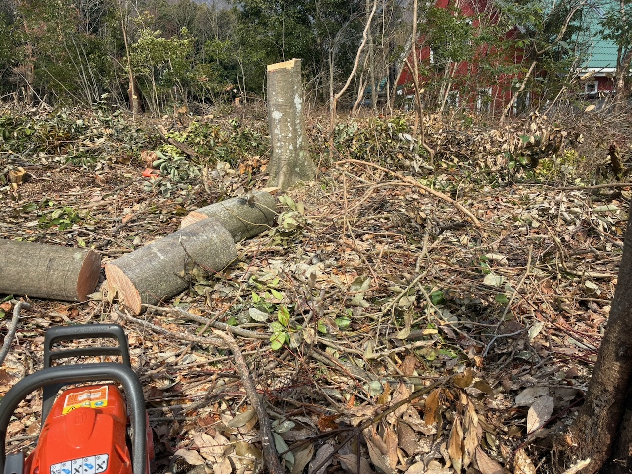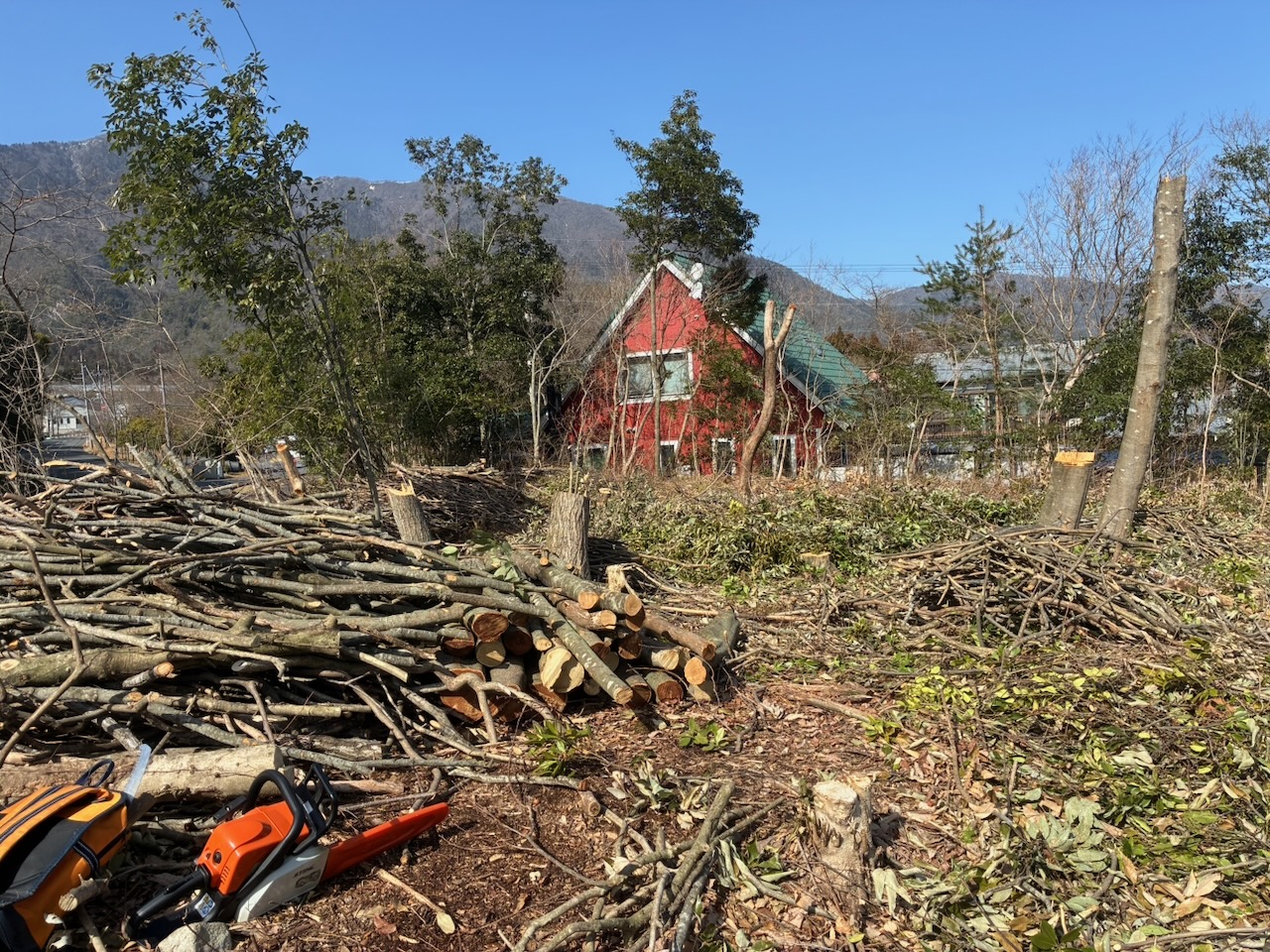 道を挟んだお向かいさん別荘宅敷地内に一時的に持ち帰った木を置かせてもらいました。