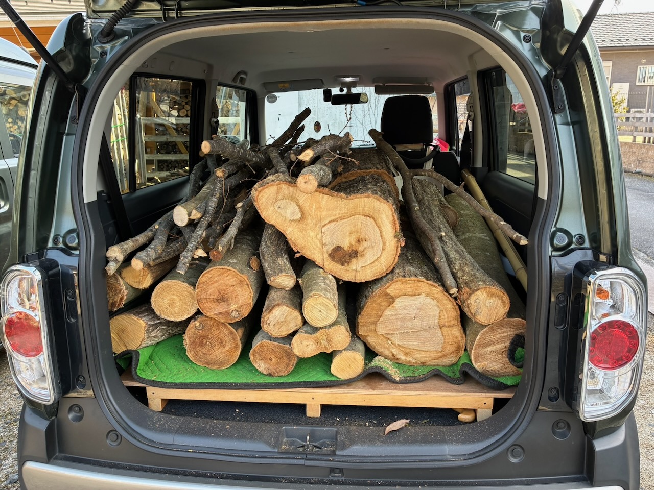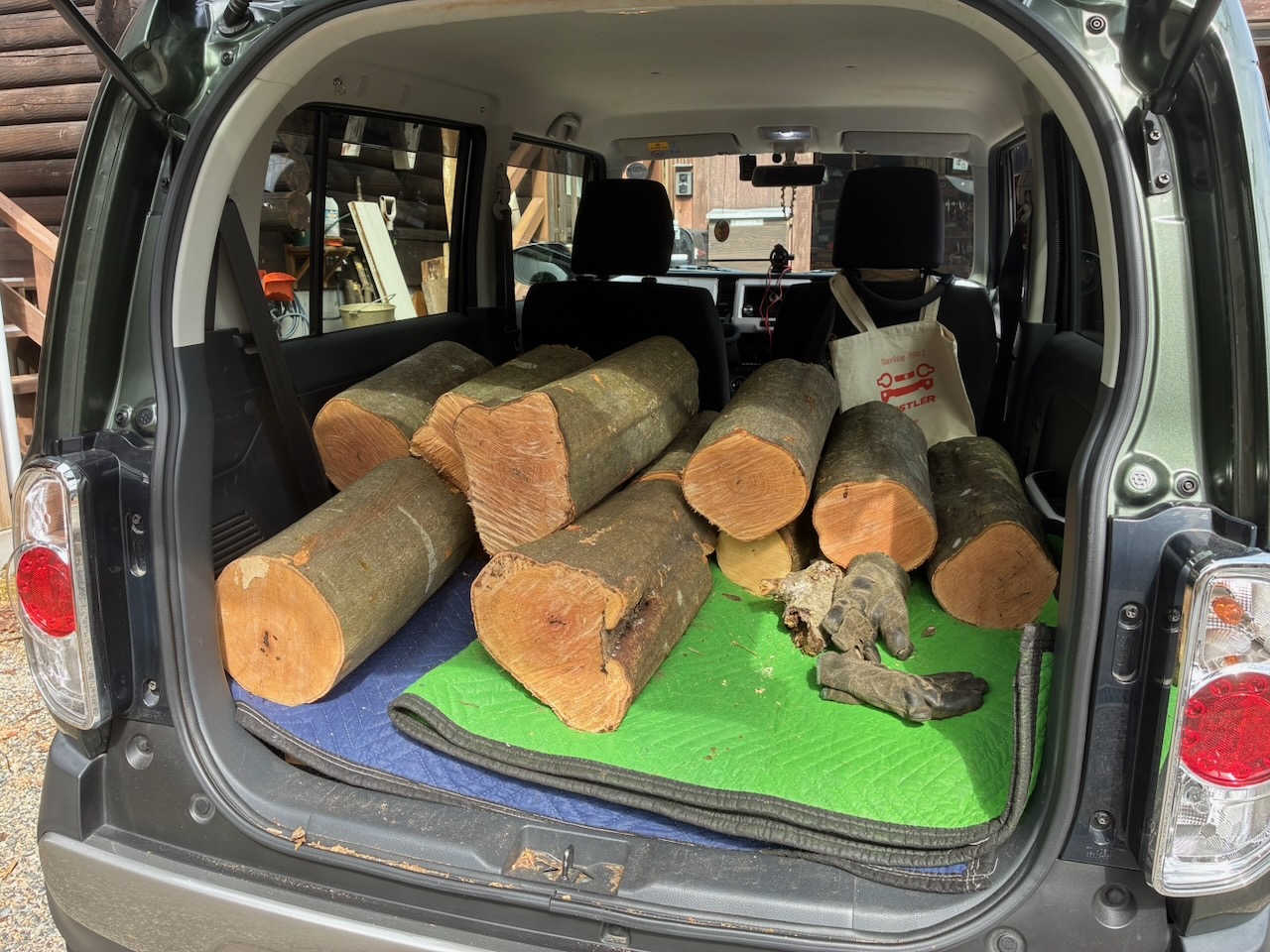 The Park 956オーナー様敷地に少し、残っていた原木をいただきました。玉切りしなくてもSuzuki HUSTLERの荷台に積載できたので、玉切りは自宅で。