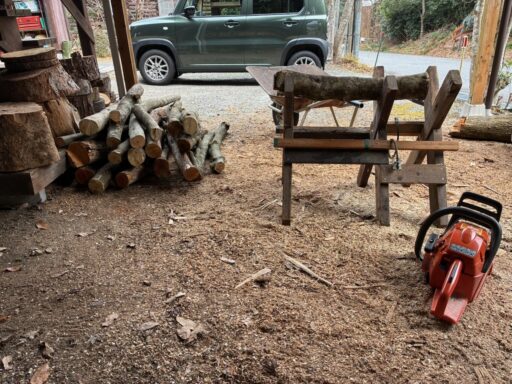 今日は伐倒師匠が湯治旅行に行っていて現場での作業はお休み。これまでに持ち帰った木をすべて玉切りしました。