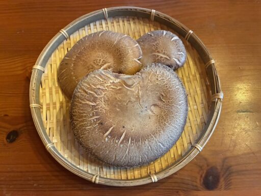 伐倒師匠に採れたばかりの立派な椎茸をいただきました。春に採れる椎茸は白っぽいそうです。