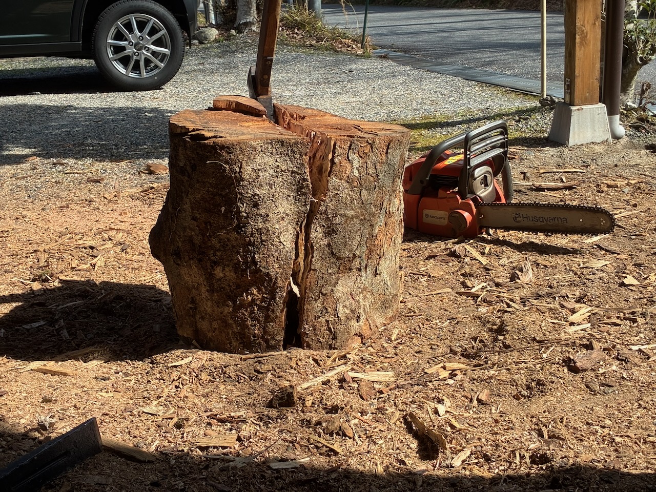 薪割りすべき大きな松の丸太が何本か残っていると思っていたのですが、そのうちの1本は硬いヤシャブシでした。斧で割ることができず、チェンソーで縦挽きしてやっと4分割。この作業に1時間は要しました。