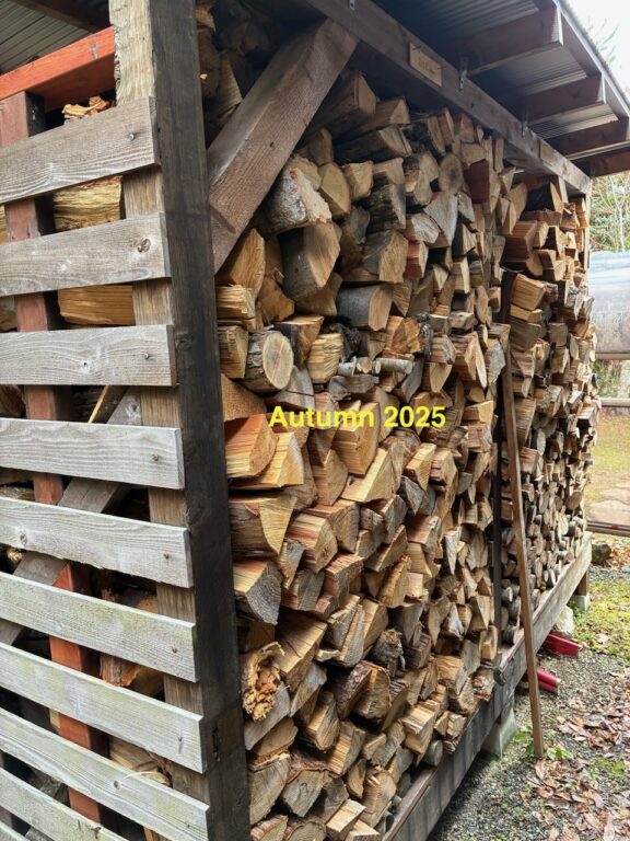 薪小屋の西側半分はすべて、今季に積み上げた薪。Autumn 2025の薪はほとんどがご近所さんにいただいたもの。