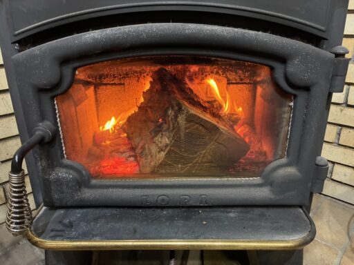 去年の春に持ち帰った丸太で、まだ完全に乾燥していないのですが、この大きな塊一つで3時間以上は火が持ちます。
