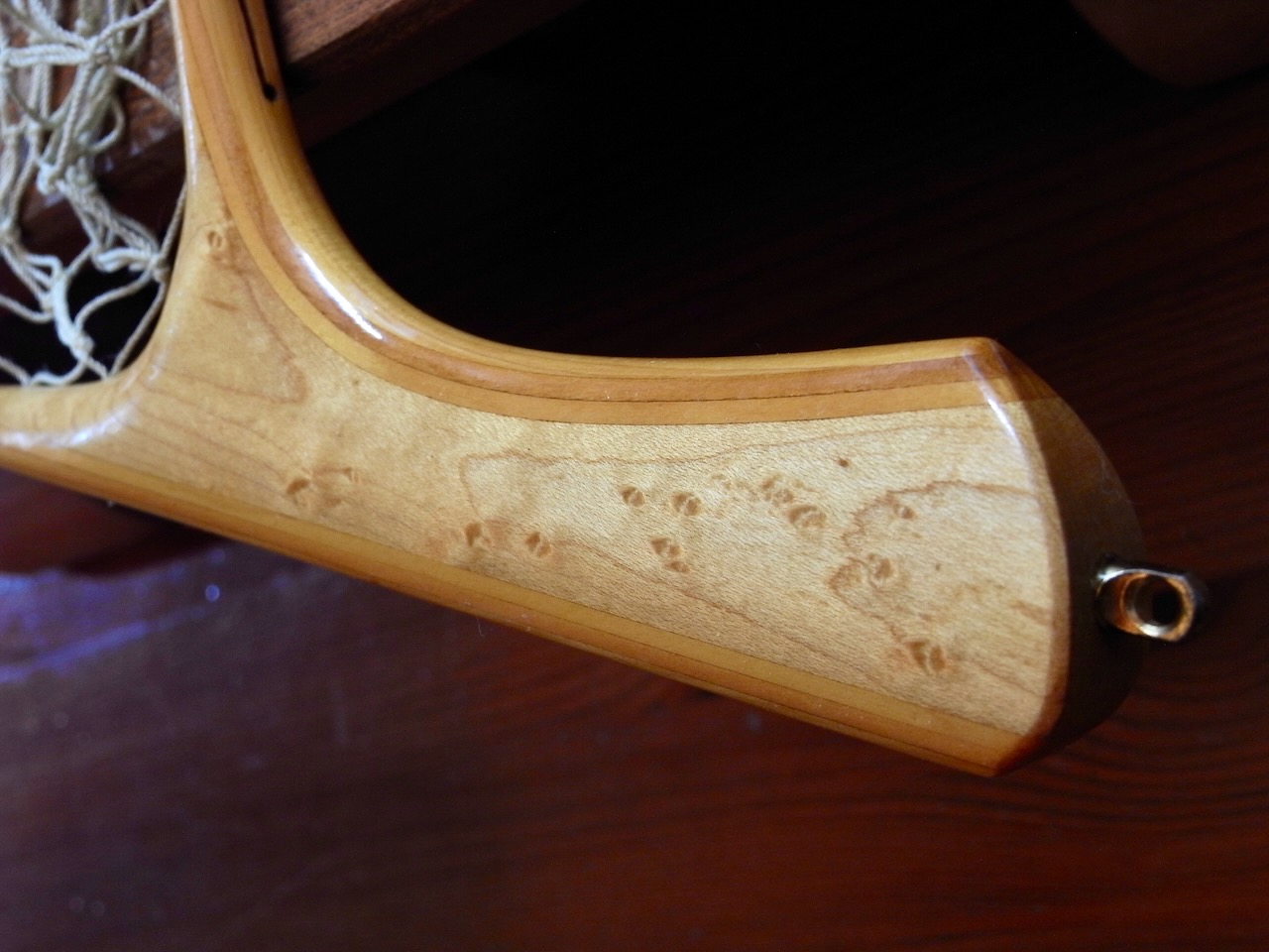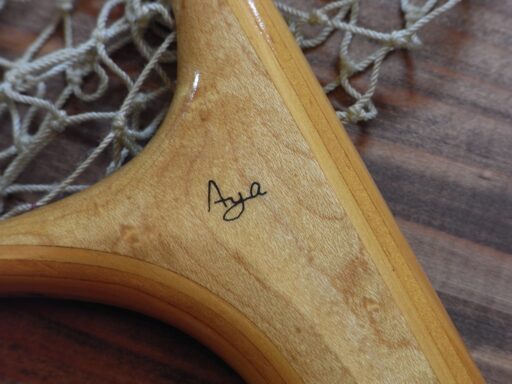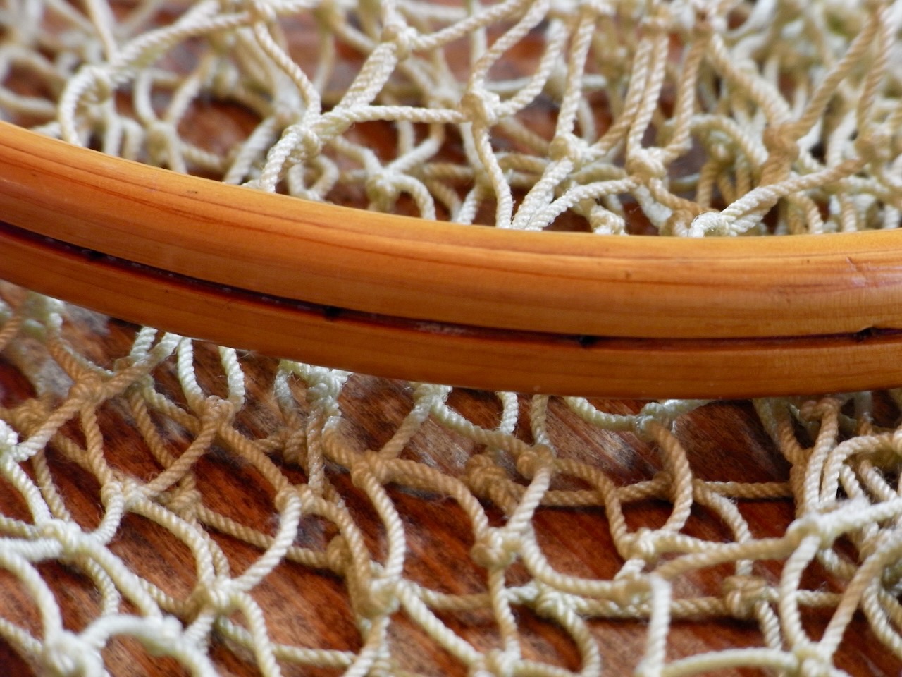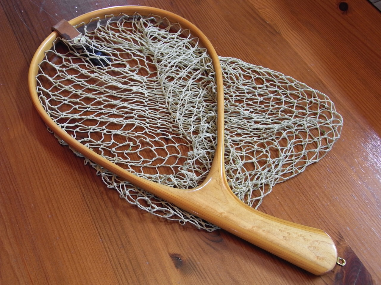 ランディングネット製作時にお手本としたのは、右のAya製ランディングネットですが、フレームの寸法は大体同じ。当時、クレモナ(クラレの登録商標)を使ってネットを自分で編む技量はなかったので、安易に洗濯ネットを代用しました。釣り上げた魚をネットに入れて写真撮影すると、手編みしたクレモナのネットの方が断然見栄えが良いので、自作したネットはほとんど使っていない状態です。フレームとグリップ部の塗装も失敗したと思っています。