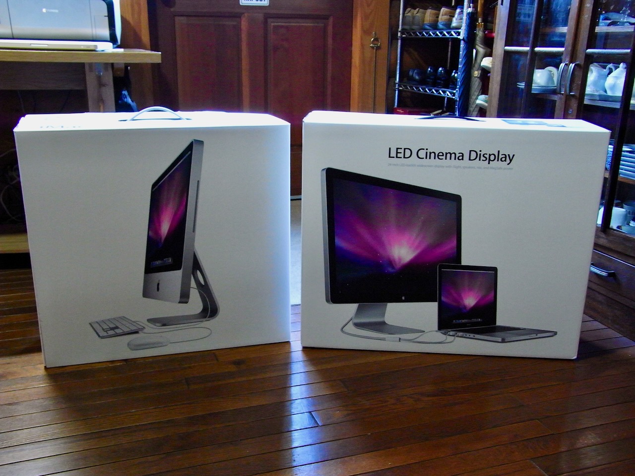 20インチのモニターはお店で見るより、ずっと大きく感じます。慣れてしまえばこれでも小さく思うかもしれませんが。起動するとすぐに言語設定の後、LeopardのWelcomeビデオが流れます。そしてユーザーアカウントの設定になりますが、その前に"Do You Already Own a Mac?"と聞いてきます。Yesの場合は別のMacから情報を移行することができます。(後からMigration Assistantを用いて情報を移行することも可能)隣に準備したiMac G5とFireWireケーブルで繋ぎ、G5の方をターゲットディスクモードで起動(起動時にTを押し続ける)します。データ転送には2時間ほど要しました。(FireWire 400ポート)その間、iMac G5はファンがフル回転、インテルiMacは起きているのか寝ているのかわからないくらい静か。アカウント設定は不要、iMac G5の使用環境がそのまま新しいiMacに移植されました。当然ながら散らかったデスクトップまで移植されてしまいました。