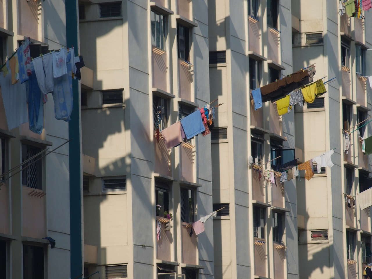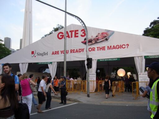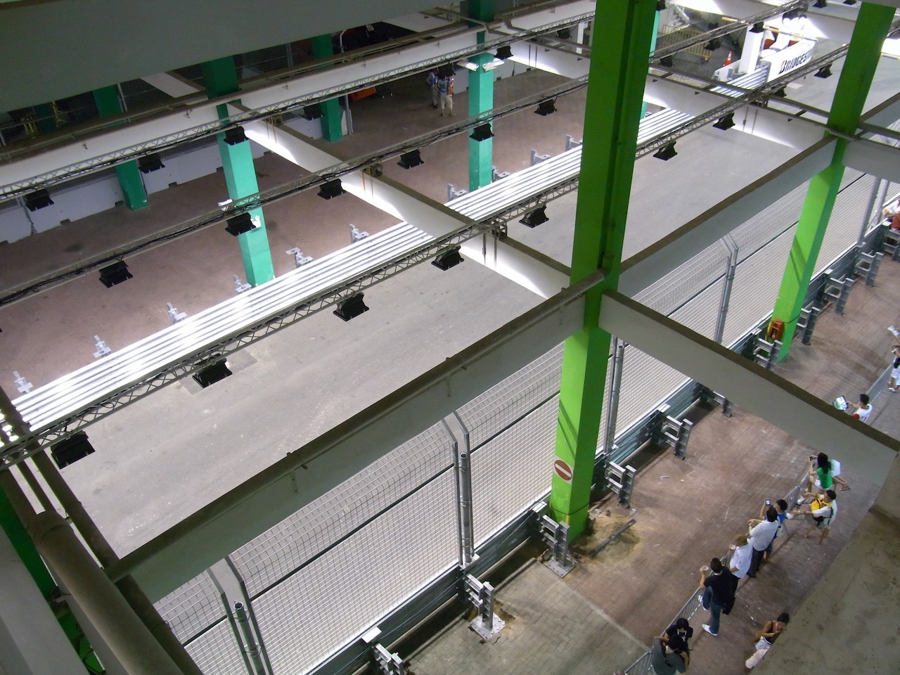 Marina Square増築部のテラスにはただ見しようと場所取りしている人が多数います。Marina Squareは、サーキットトラック内側にある商業施設ですが、シンガポールGP主催者がこの建物を借りているわけではないので、目隠しの幕を張ることができません。サーキットトラック内側のホテル客室から観戦するのと状況は同じ。