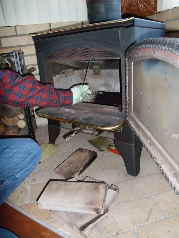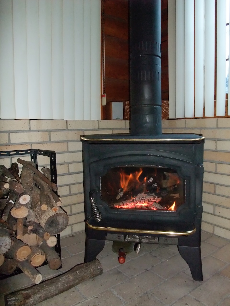 このストーブはヤカンで湯を沸かしたり、調理器具として使用できないのは耐火煉瓦のためでしょう。逆に耐火煉瓦がドア部分を除く燃焼室全面にない薪ストーブでは燃やさない方が良いとされる針葉樹(すぐに高熱で燃える)もガンガン燃やしても大丈夫という特性があると思います。