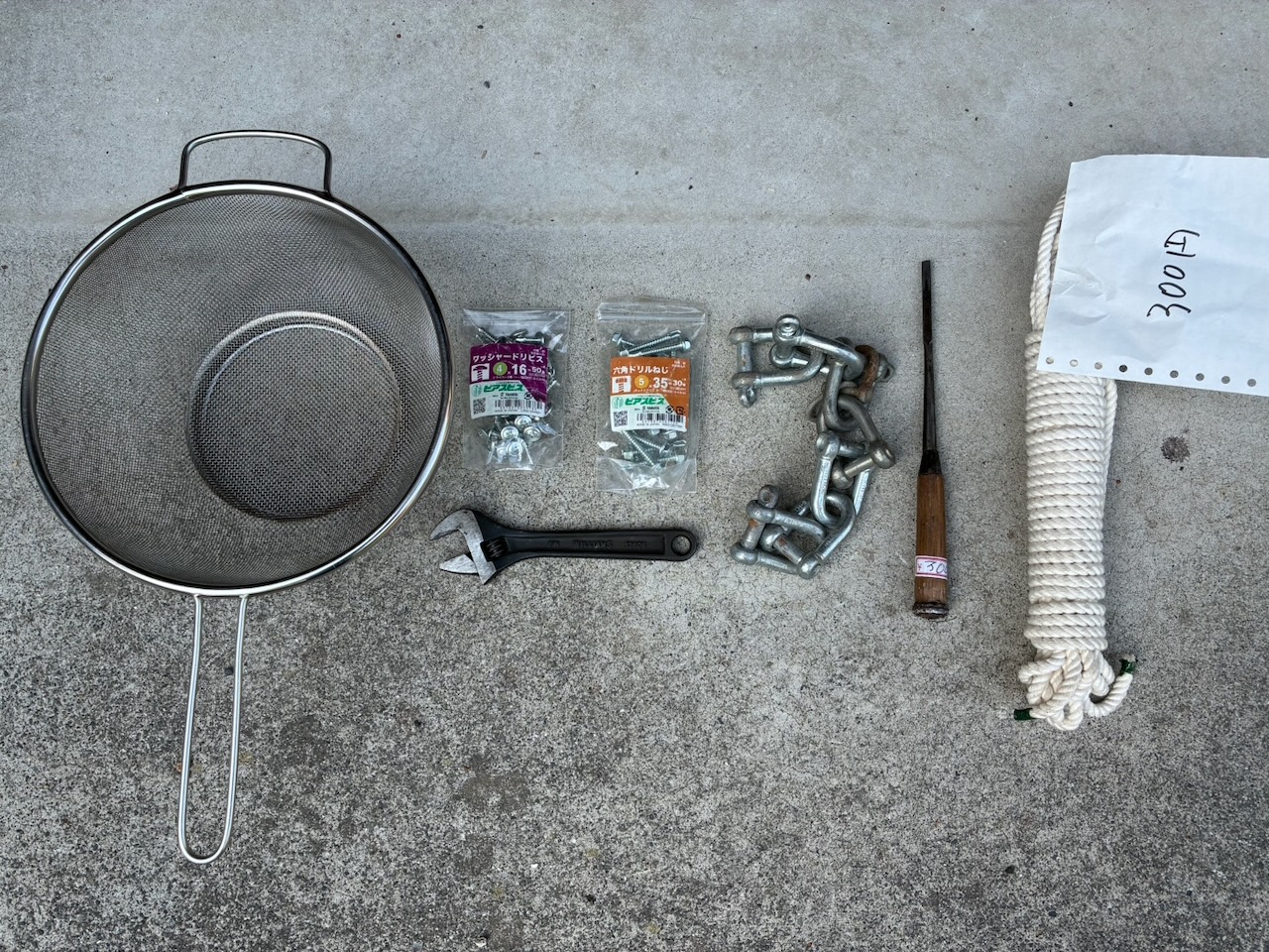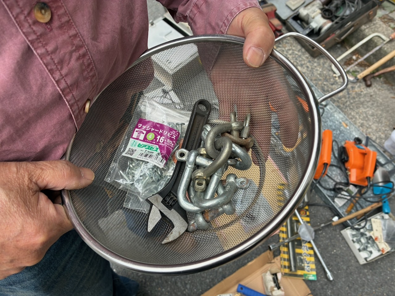 他に金属製のざるも入手しました。これだけ買って合計500円のお得意様価格。