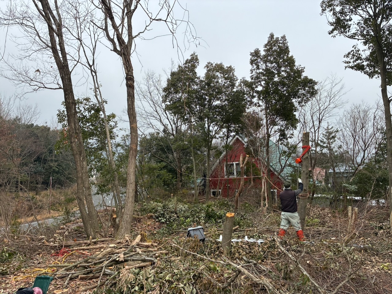 純正部品3点を交換したHusqvarna 440e IIを使って、道を挟んだお向かいさん別荘宅敷地内に仮置きさせていただいている原木の玉切りをしました。440e IIはエンジン始動方法が、236eとは大きく異なりますが、すっかり慣れました。